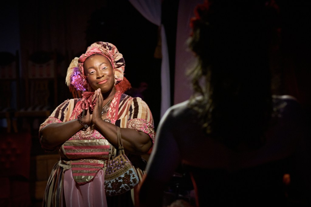 The Revolutionists is a visually exciting production full of colour and texture, from flowers and velvet draperies to the swishing of skirts, the shimmer of sequins, and the sway of towering headpieces. The costumes, co-designed by Michael Beh and Jan Mandrusiack, are truly a high point and were shown off to full effect by cabaret and catwalk interludes throughout, with choreography by Sarah O’Neill. Lighting designed and operated by Bethany Scott added drama to the key moments and directed the eye of the audience across the long stage space, complemented by music direction and arrangement by Paul C McD. The musical interludes were brilliantly performed – Asabi Goodman’s breathtaking rendition of Feelin’ Good; Lauren Roche’s rock’n’roll So What; Lisa Hickey’s wistful At Seventeen – although they didn’t feel particularly connected to the narrative action.