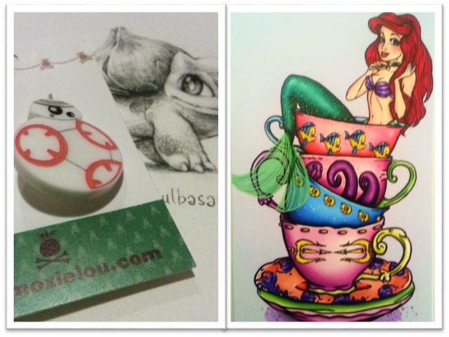 | BB-8 brooch from Moxie Lou (L), business card from Hungry Designs (R) |