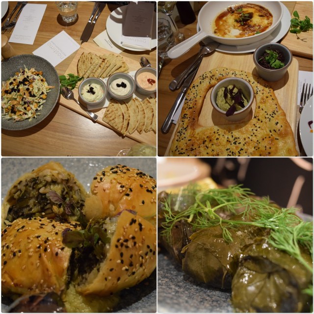 | Clockwise from top left: Greek Slaw, Dips & Pita; Saganaki with Carmelised Figs and Bread with olive butter and tapanade; Dolmade (stuffed vine leaves); Horopita (wild greens in pastry). |