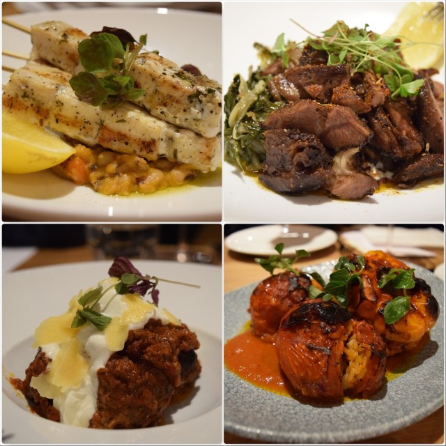 | Clockwise from top left: Nostimo signature dish Swordfish Kalamaki; Lamb Souvla; Yemista (stuffed vegetables); Soutzoukakia of Smyrni (Greek meatballs). |