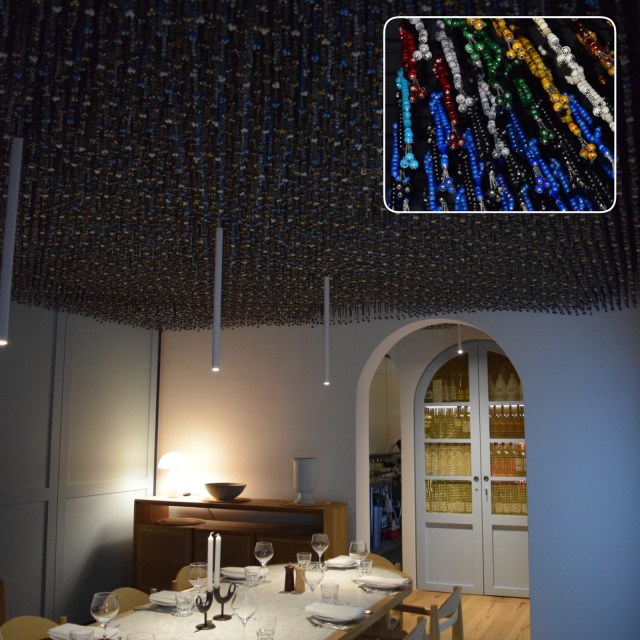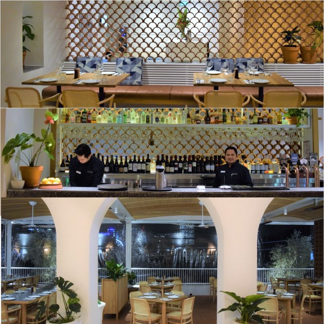 The 180-seat restaurant space is beautiful, very light and open even after the sun has set, with rendered white walls, archways, thatched ceilings, terrazzo finishes, and over 15,000 cascading kombolói (Greek worry beads) suspended from the ceiling.