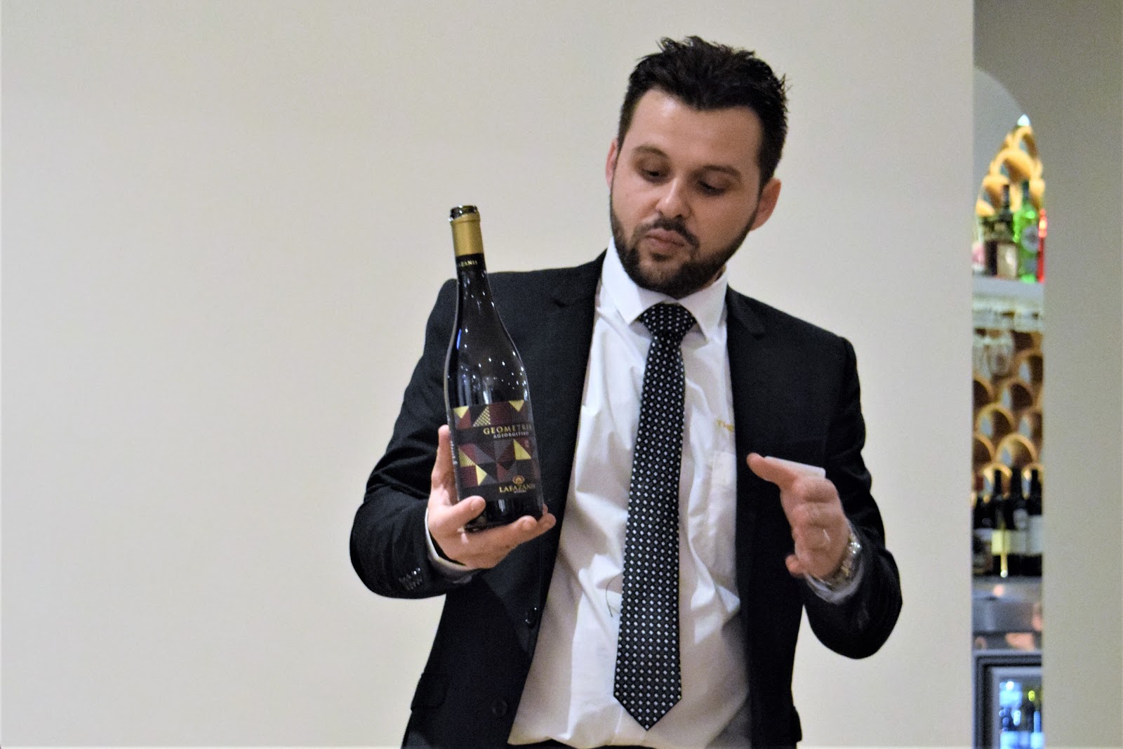 | Restaurant Manager Kostas explains one of the wines we enjoyed with our meal |