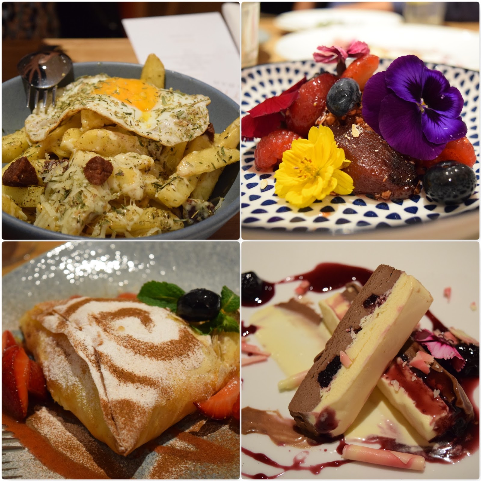 | Clockwise from top left: Chips Vromiko (served with Horta, steamed greens); quince with fresh fruit and edible flowers; Chef’s surprise desserts. |