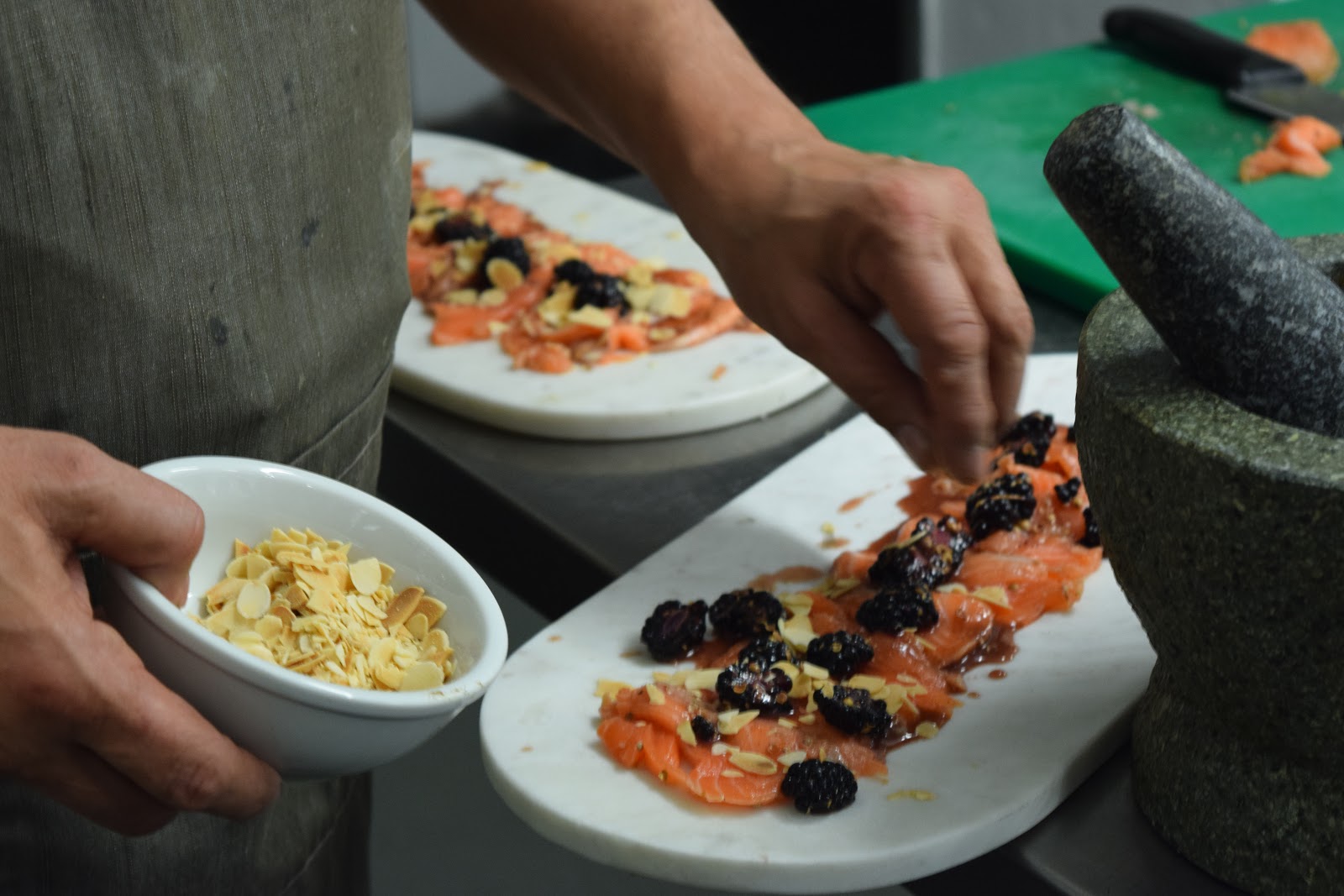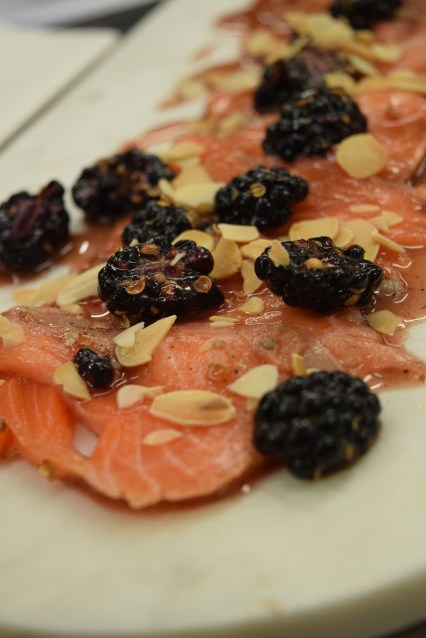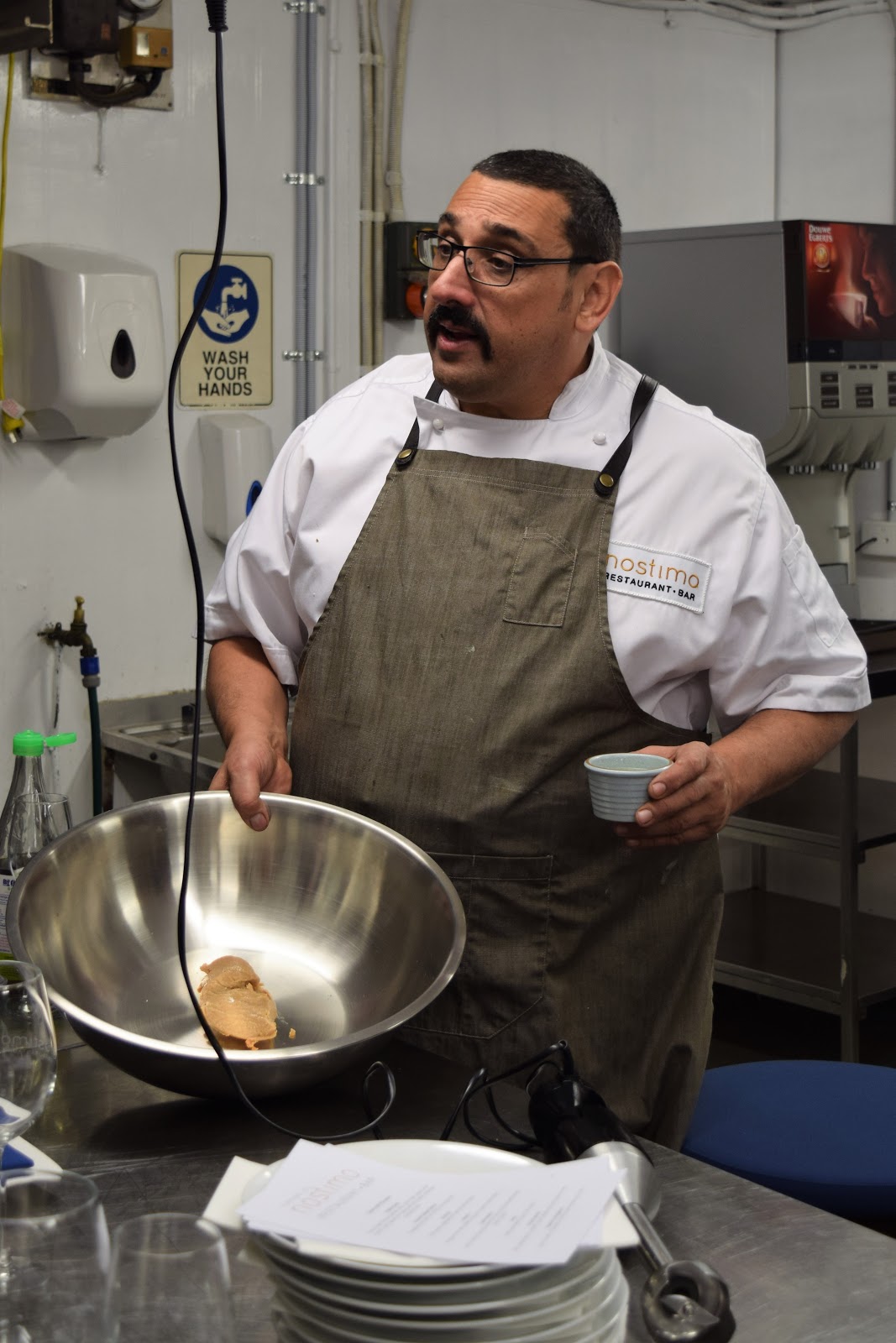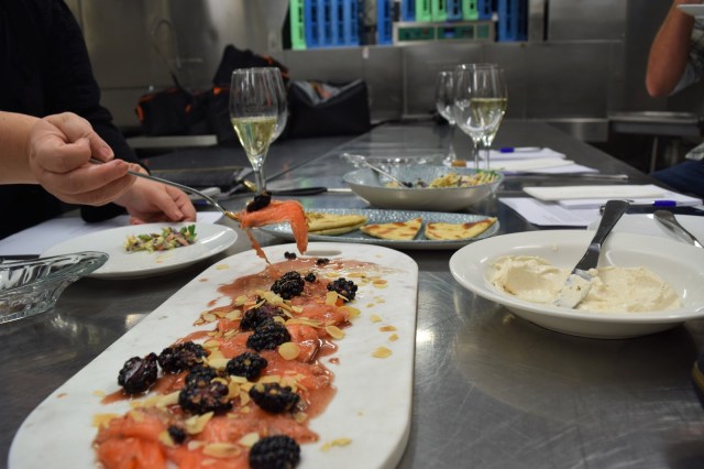 Eight of us sat around the stainless-steel bench as David demonstrated how to make Tarama (fish roe) Dip, and Ancient Glazed Salmon – a modernisation of an ancient Greek dish, uncovered by David in his Greek history studies and transcribed, from ancient Greek poet Archestratus in 332BC. The salmon was preserved in distilled spirits (ouzo) and fermented anchovy sauce, and David served it with blackberries, almonds, and honey. The dish was described by Archestratus, who Wikipedia tells me was known as “the Daedalus of tasty dishes”. I am a vegetarian, so I didn’t try either of these dishes, but the others said that the flavours were magnificent. Their facial expressions as they ate said it all!