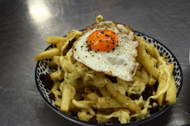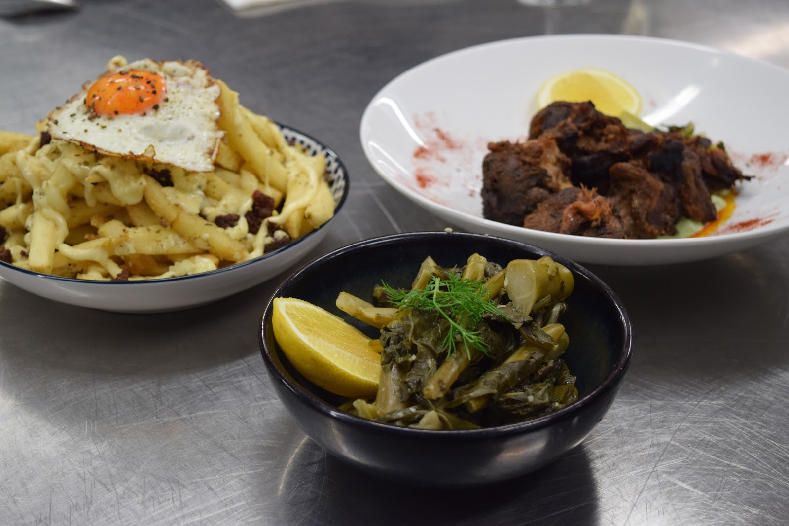 Lamb Shoulder Kondosouvli with wilted spinach, herbed yoghurt; Horta, wilted greens with lemon dill and olive oil; Chips Vromiko, chips with fried egg and