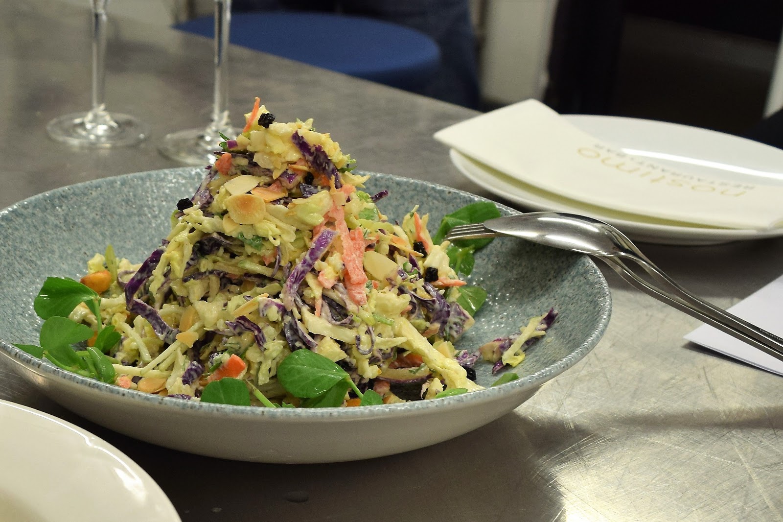 Politiki Salata savoy purple Chinese cabbage, carrot, green apple, graviera, dried currants, spicy roasted corn, toasted almonds, mustard mayonnaise, mixed fresh herbs: