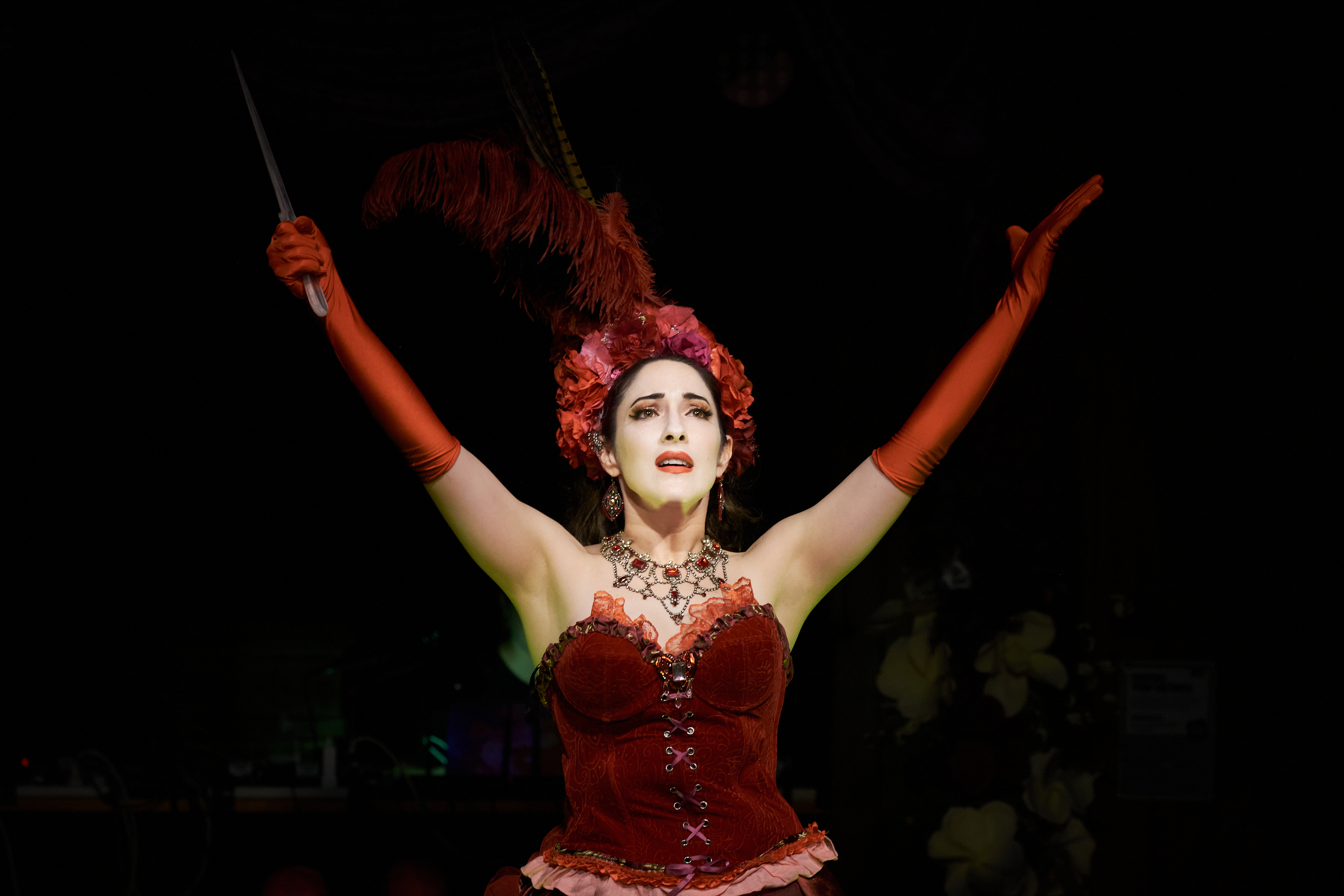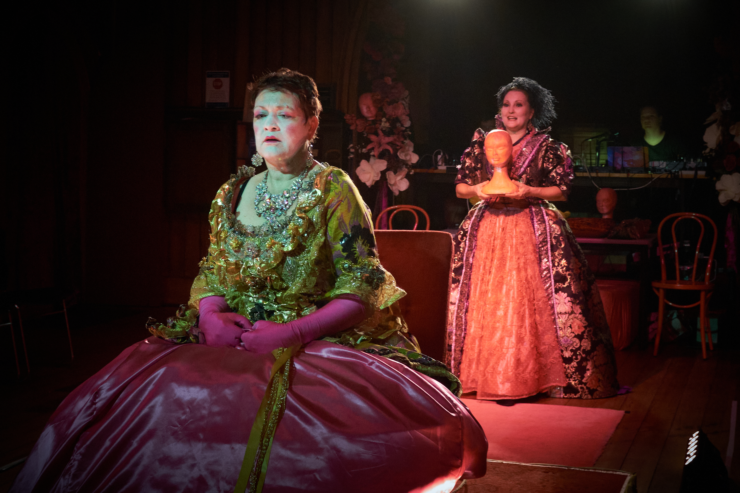 The Revolutionists is a visually exciting production full of colour and texture, from flowers and velvet draperies to the swishing of skirts, the shimmer of sequins, and the sway of towering headpieces. The costumes, co-designed by Michael Beh and Jan Mandrusiack, are truly a high point and were shown off to full effect by cabaret and catwalk interludes throughout, with choreography by Sarah O’Neill. Lighting designed and operated by Bethany Scott added drama to the key moments and directed the eye of the audience across the long stage space, complemented by music direction and arrangement by Paul C McD. The musical interludes were brilliantly performed – Asabi Goodman’s breathtaking rendition of Feelin’ Good; Lauren Roche’s rock’n’roll So What; Lisa Hickey’s wistful At Seventeen – although they didn’t feel particularly connected to the narrative action.