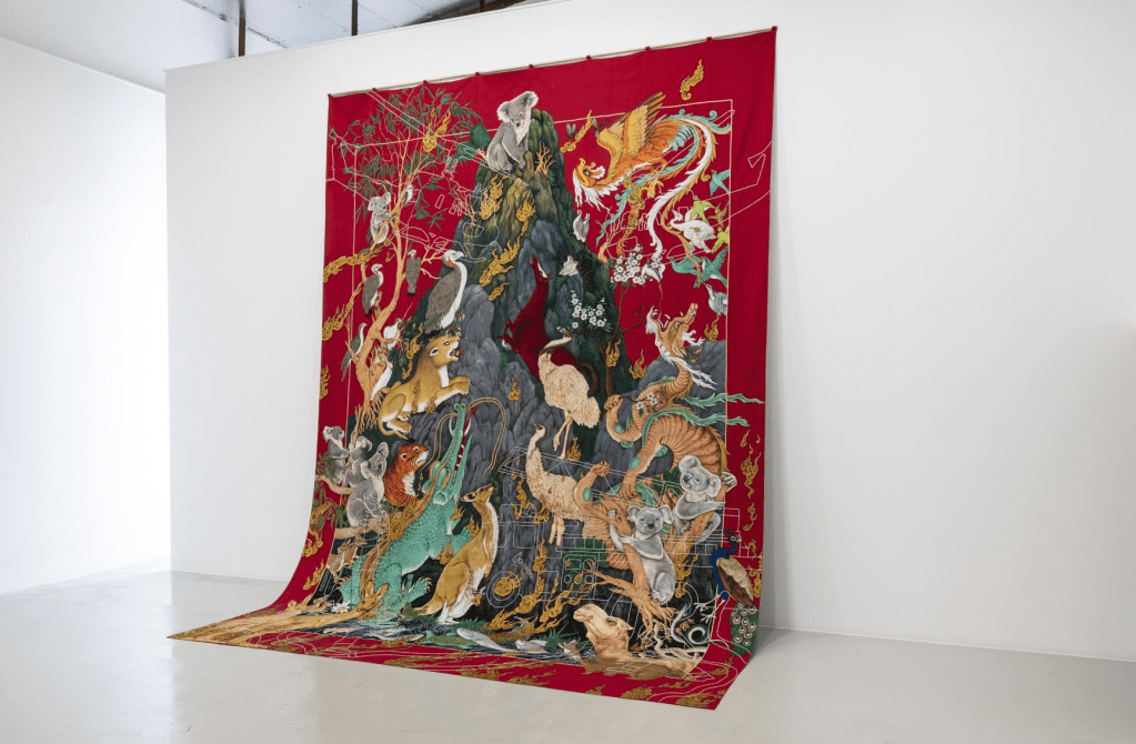 Exhibition highlight Invisible Border 1 is a nine-metre-long tapestry, hand-woven by a community of Hazara men and women, some of whom lost family members to war. Also on display is Ali’s most recent work, Sermon on the Mount, an exquisite handwoven tapestry depicting a cast of animals and mythical creatures seeking refuge atop a mountain engulfed in flames. A response to the 2020 Black Summer bushfires which devasted much of Australia’s bushland, the tapestry references the teachings of Jesus Christ and portrays a koala delivering a prophecy that foretells the destruction of mother nature at the hands of humankind. Commissioned for Invisible Border and recently acquired by the National Gallery of Australia, Sermon on the Mount is an evocative and poignant reflection of our collective fears around climate change. Ali’s interest in tapestries developed soon after his parents’ home in Quetta, Pakistan was destroyed by suicide bombers. Among the rubble and debris, a collection of rugs and weavings remained intact; miraculously withstanding the reign of terror inflicted upon his family and community.