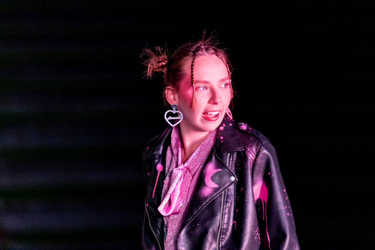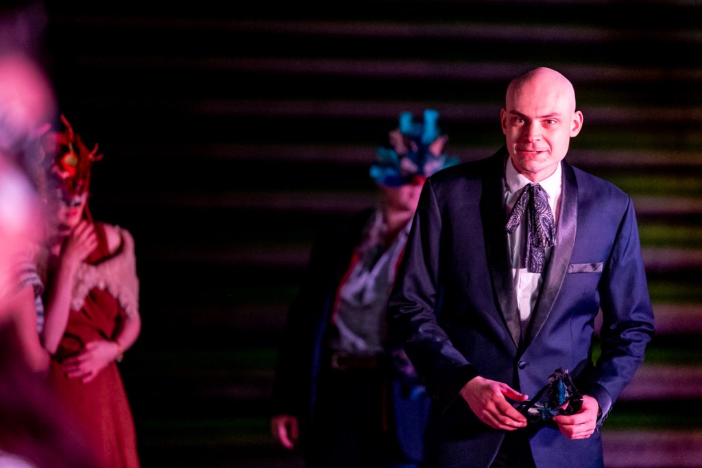 There was a wonderfully sweet chemistry between Liliana Macarone’s emotional and eager Romeo and Sarah Doyle’s wide-eyed Juliet from their first moments onstage together. By contrast, the energy between Rebekah Schmidt’s fiery Mercutio and John Siggers’ sharply dressed, barely restrained Tybalt crackled with malice and a hunger for violence. Schmidt gave a standout performance, bringing a ferocious and chaotic energy to the role of Mercutio and then switching seamlessly to the grounded anger of Verona’s Prince. Angus Thorburn was an excellent, exasperated Benvolio and, with an affected accent and manner, also brought a comedic angle to the character of Paris.