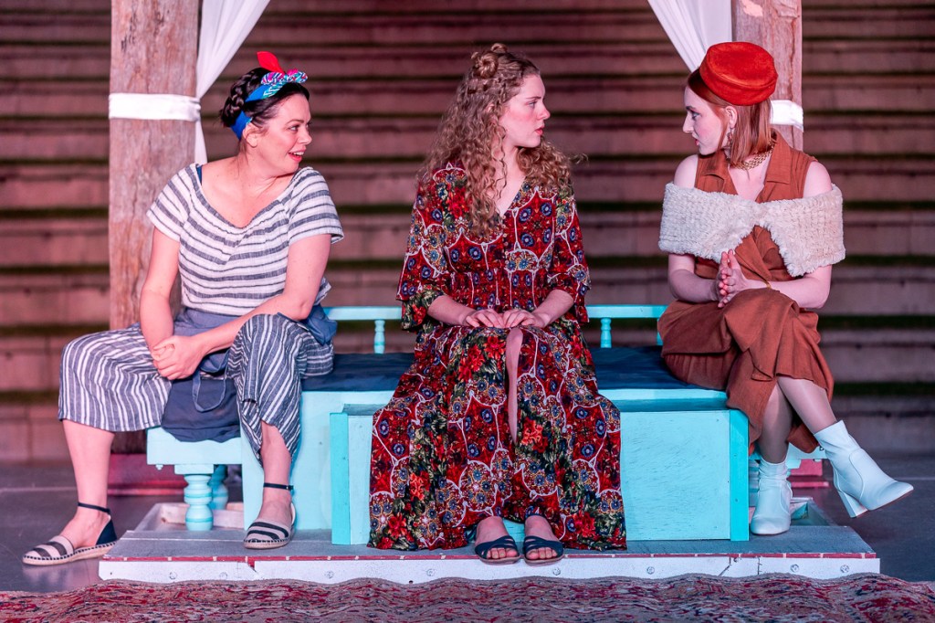 Characteristic of Queensland Shakespeare Ensemble’s performances, the audience was seated on the amphitheatre stage, intimately close to the action and emotion of the work. The many-talented cast also performed live music as the band ‘Maiden Blush’ before the show and during the interval, playing original compositions inspired by the play, with music direction by Rob Pensalfini.