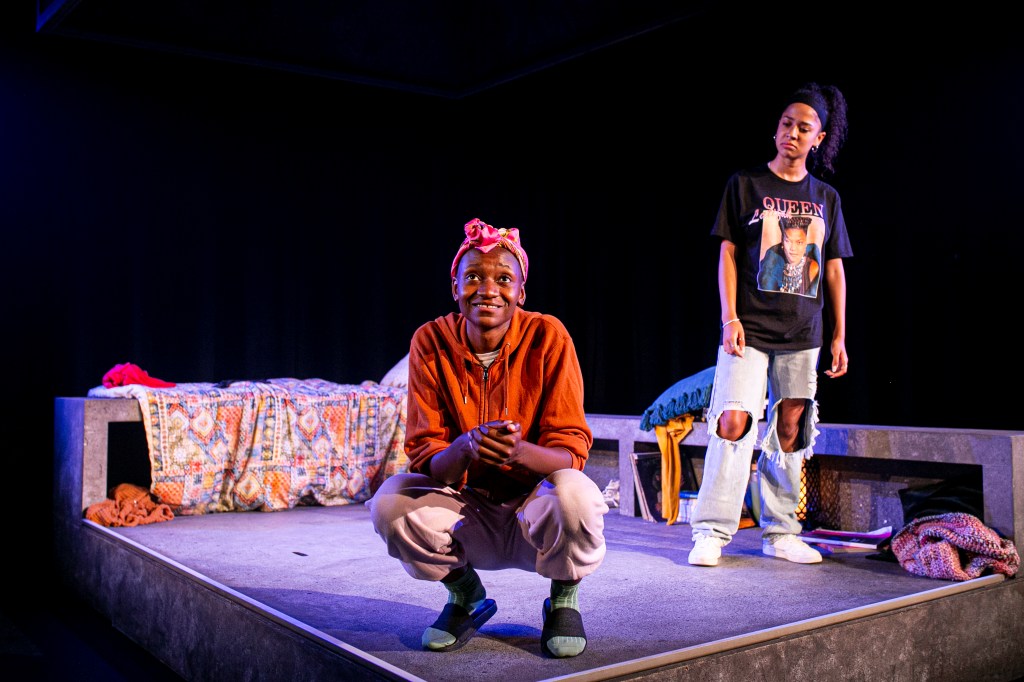 Moreblessing Maturure and Iolanthe delivered outstanding and unforgettable performances as Cleo and Kara, and their onstage chemistry was dynamic as they performed highly physical blocking and rapid-fire dialogue. They held absolute control of the room throughout the 90-minute work, turning the audience from cackling laughter to breathless, uncomfortable silence on a dime. Cleo’s monologue, close to the end of the play and including the story of Saartjie Baartman, was especially raw and confronting. Both Maturure and Iolanthe maintained consistent English accents, with voice and dialect coaching by Angela Sullen, and their enunciation remained crisp even as the delivery of their lines approached breakneck speed.