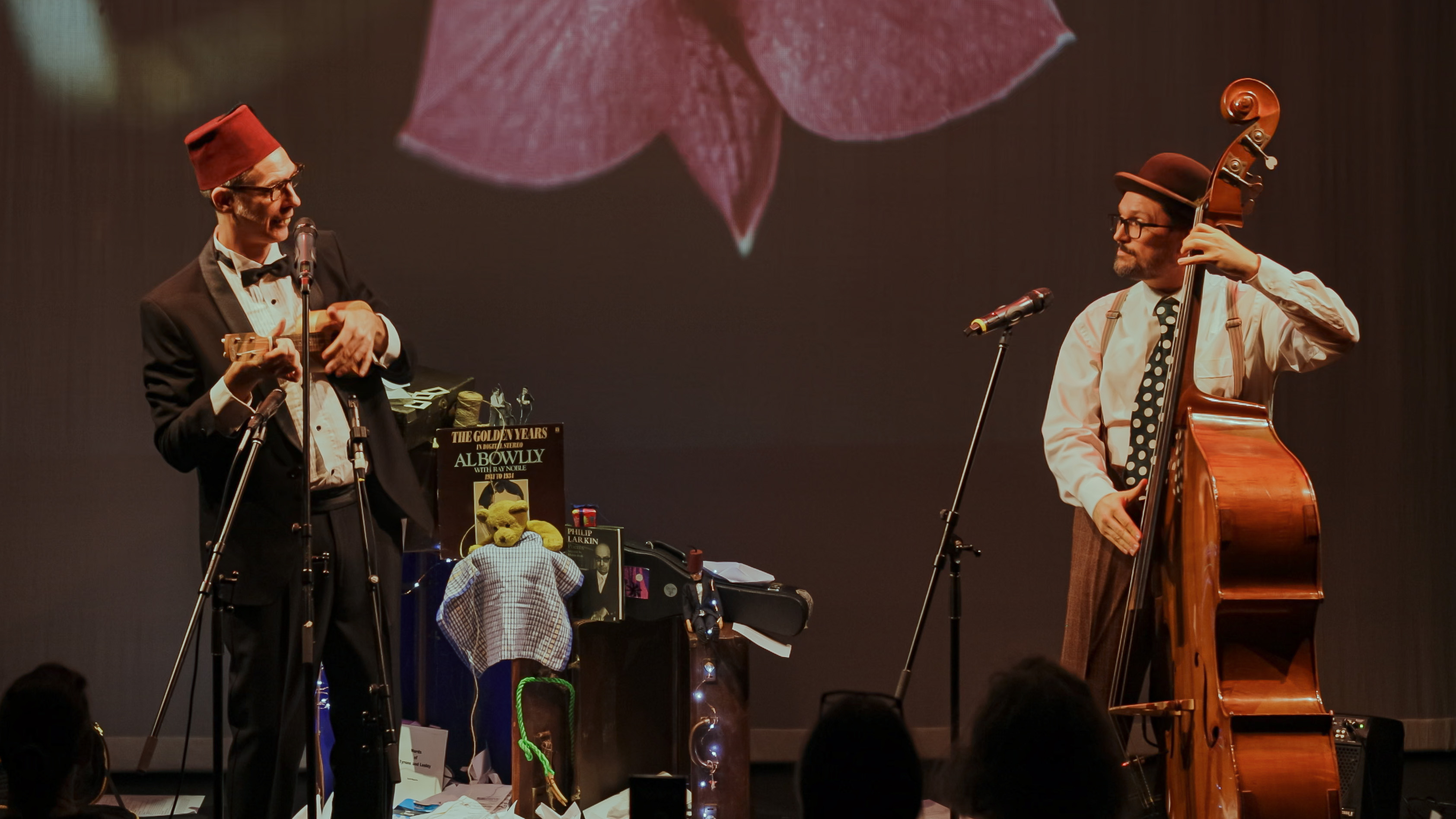 Tyrone (Megarrity) and Lesley (Vincent) have been a songwriting and performance duo for more than 20 years, and this was evident in their easy and comfortable onstage rapport, filled with quirky comedy and commentary, as well as their significant musical skill. Megarrity carried the verbal narrative of the show and played the ukulele, while Vincent plucked and bowed the double bass, hummed, harmonised, and played the kazoo.