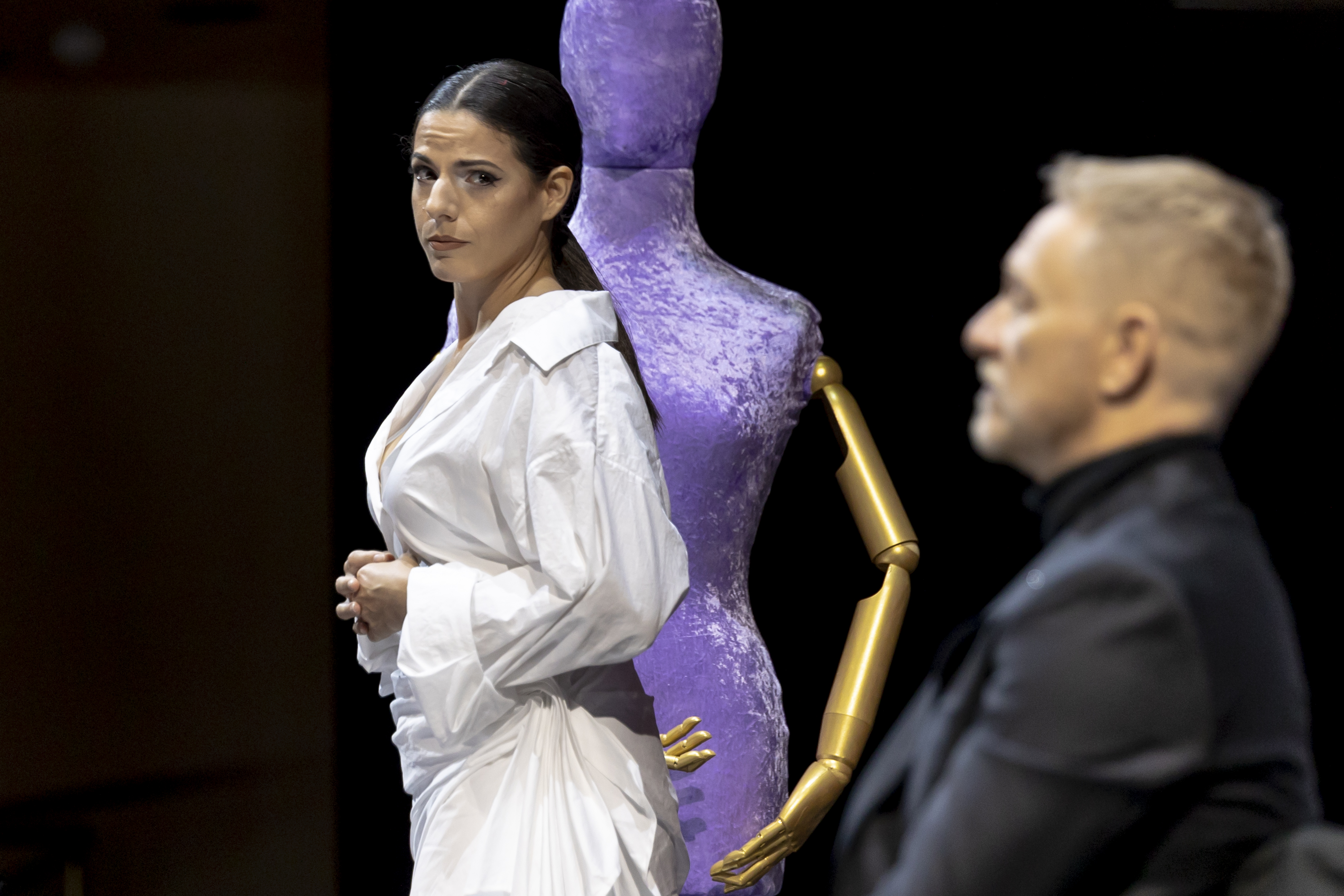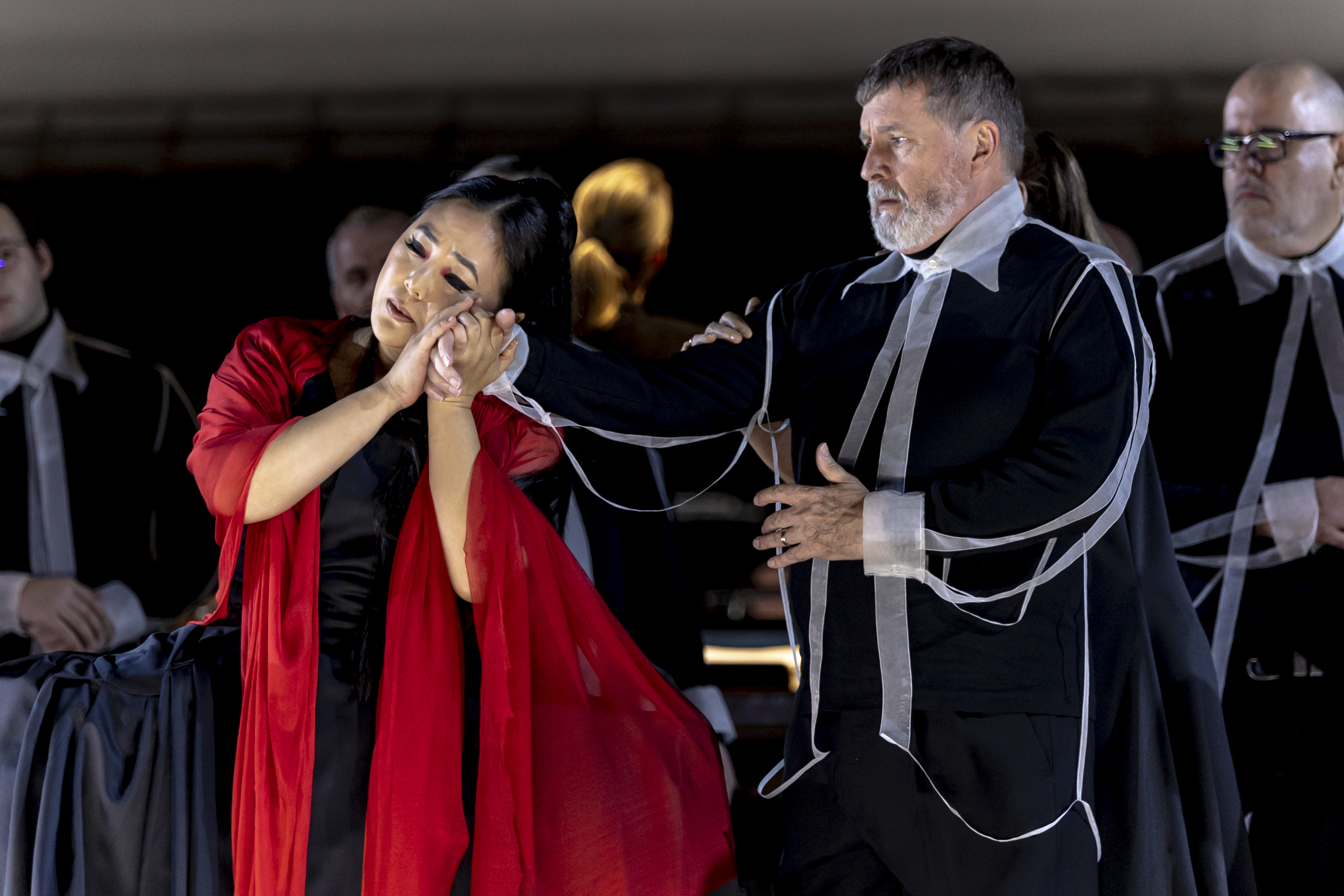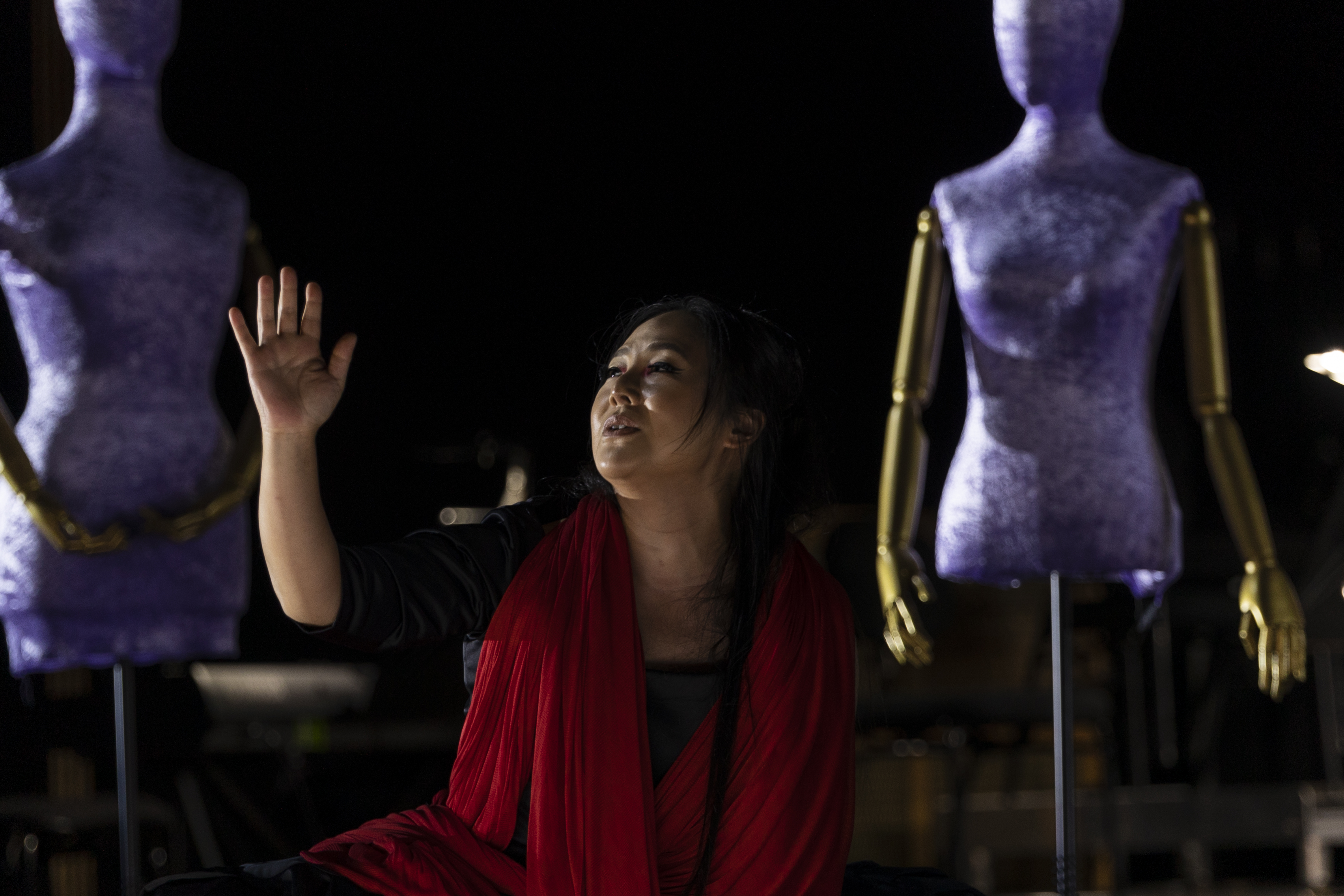 Concept design by Marg Horwell and costuming by Karen Cochet and Bianca Bulley used a simple colour palette of red, white, and black to create interesting shapes and striking silhouettes that evoked haute couture. Each soprano’s costuming had layers, one of which she would leave onstage after her performance was finished. Arrayed on one of the mannequins placed between the singers and the orchestra, each character left this piece of herself behind, adding to the next woman’s story and building a collective backdrop of their passion, resolve, grief, and contemplation.