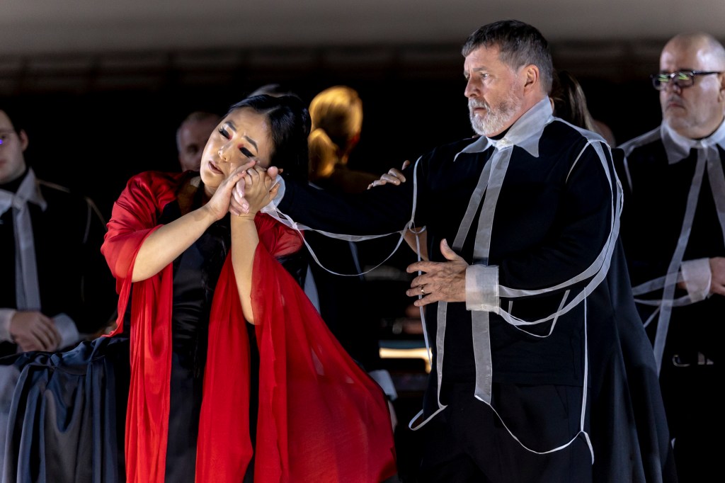Salve regina from Les dialogues des Carmélites, sung by Amber Evans, Dominique Fegan, Tania Ferris, Hayley Sugars, Sofia Troncoso, and the Opera Queensland Chorus, was an incredibly moving conclusion to the first Act, with the harmony and richness of their many voices diminishing under the swish of the guillotine. Another personal highlights for me was the tense Please don’t die, Jan from Breaking the Waves, brilliantly performed by Sofia Troncoso and Michael Honeyman. The performance concluded with the Humming Chorus from Madama Butterfly with the full company onstage.