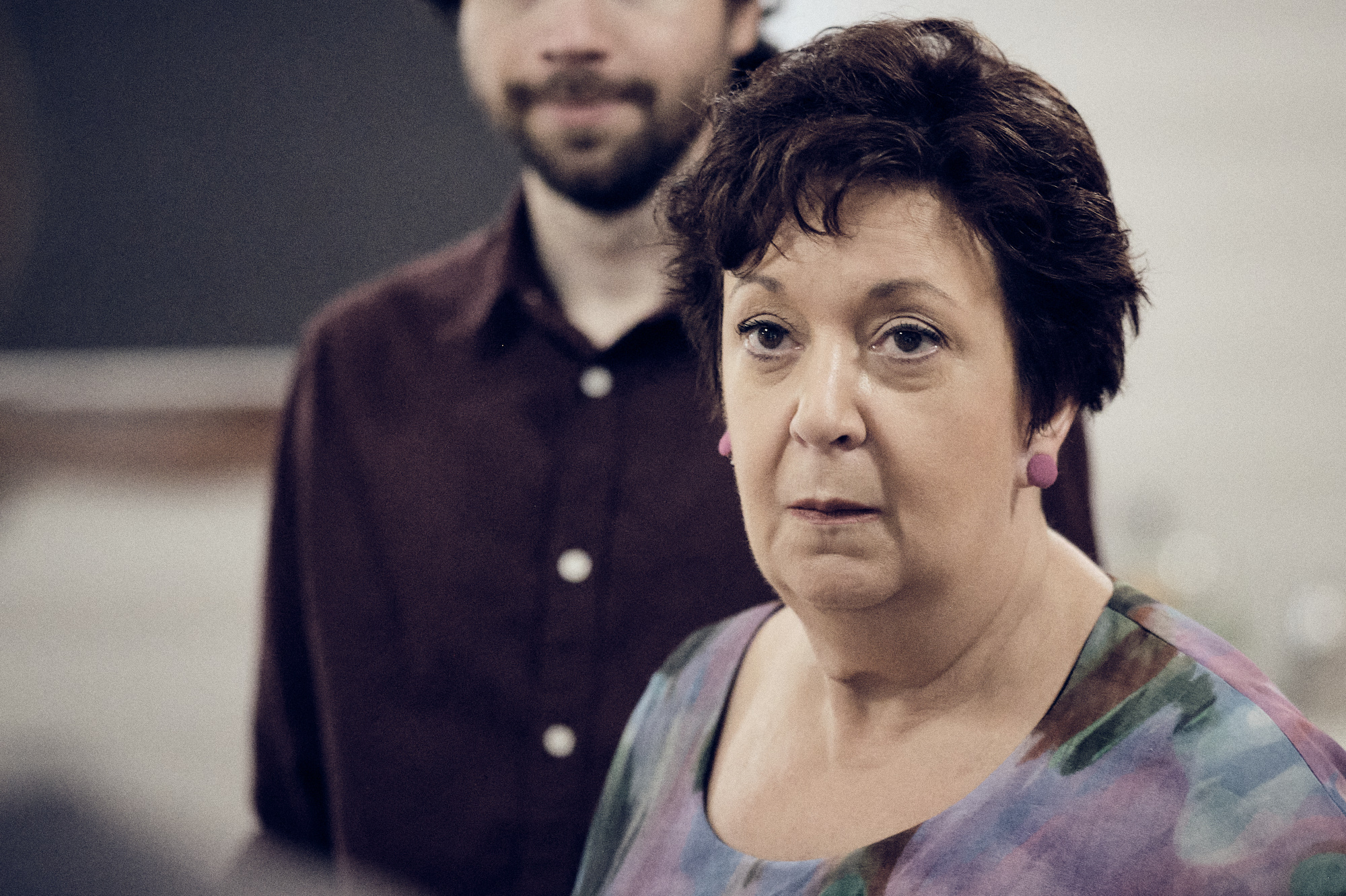 Nathan Kennedy played a tightly wound and practical Steven, contrasted against Aidan O’Donnell’s emphatic and enthusiastic Barry. Highly physical blocking established a clear relationship between the two brothers, and O’Donnell’s impressive delivery of his character’s final monologue was chilling. Sandra Harman brought a grounded maternal energy to the stage as Liz, creating a balance between the high tensions of Barry and Steven and building a well-rounded character who was many things – a grieving widow, an overbearing mother, and a woman struggling to maintain a story about her life and her family that she could live with. Caroline Sparrow played the role of Debbie, Steven’s self-assured wife, providing comic relief with both scripted and physical comedy but also holding her own in confronting emotional scenes. Debbie, as a character, offered the audience more of an outside perspective on the insular family dynamic, and Sparrow’s use of facial expressions and body language mirrored the response of the audience in those scenes. The play is set in London and the cast adopted English accents, although these were not entirely consistent between the actors or throughout the production.