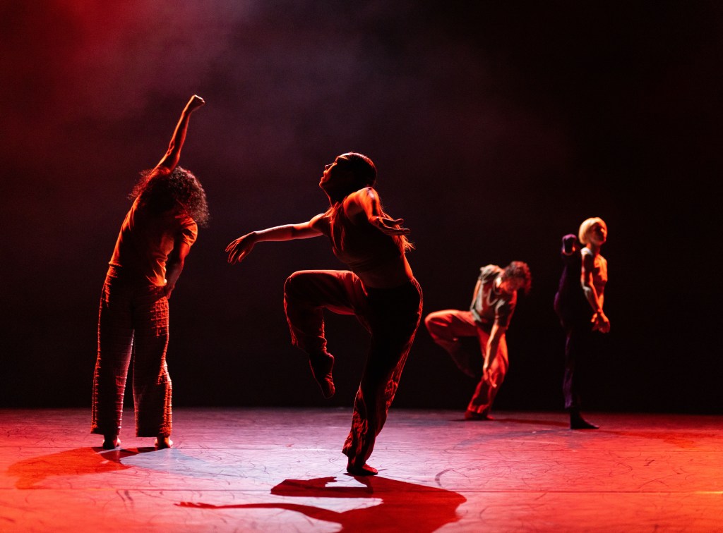 The first piece of the evening was Limbic, choreographed by Cass Mortimer Eipper to a composition by Alyxandra Dennison. Limbic was a strong start to the performance, and remained the choreographic standout for me. Cass Mortimer Eipper’s choreography showed a strong balletic influence and was characterised by expansive, sweeping arm movements and sudden changes of pace to both the composition and the choreography, emphasised by harsh, dramatic transitions in the lighting. A rollercoaster of smoke, shadows, and sensory stimuli, Limbic became increasing frenzied and full of contrasts with stop-start choreography, smooth fluidity and sharp movement, and impressive leaps and floor work. Each dancer made the piece their own, but the ensemble had a strong sense of cohesion, overall. A large spotlight created additional boundaries in the stage space, and colourful, textured costuming designed by Zoe Griffiths added to the sensory intensity and controlled chaos of the piece.