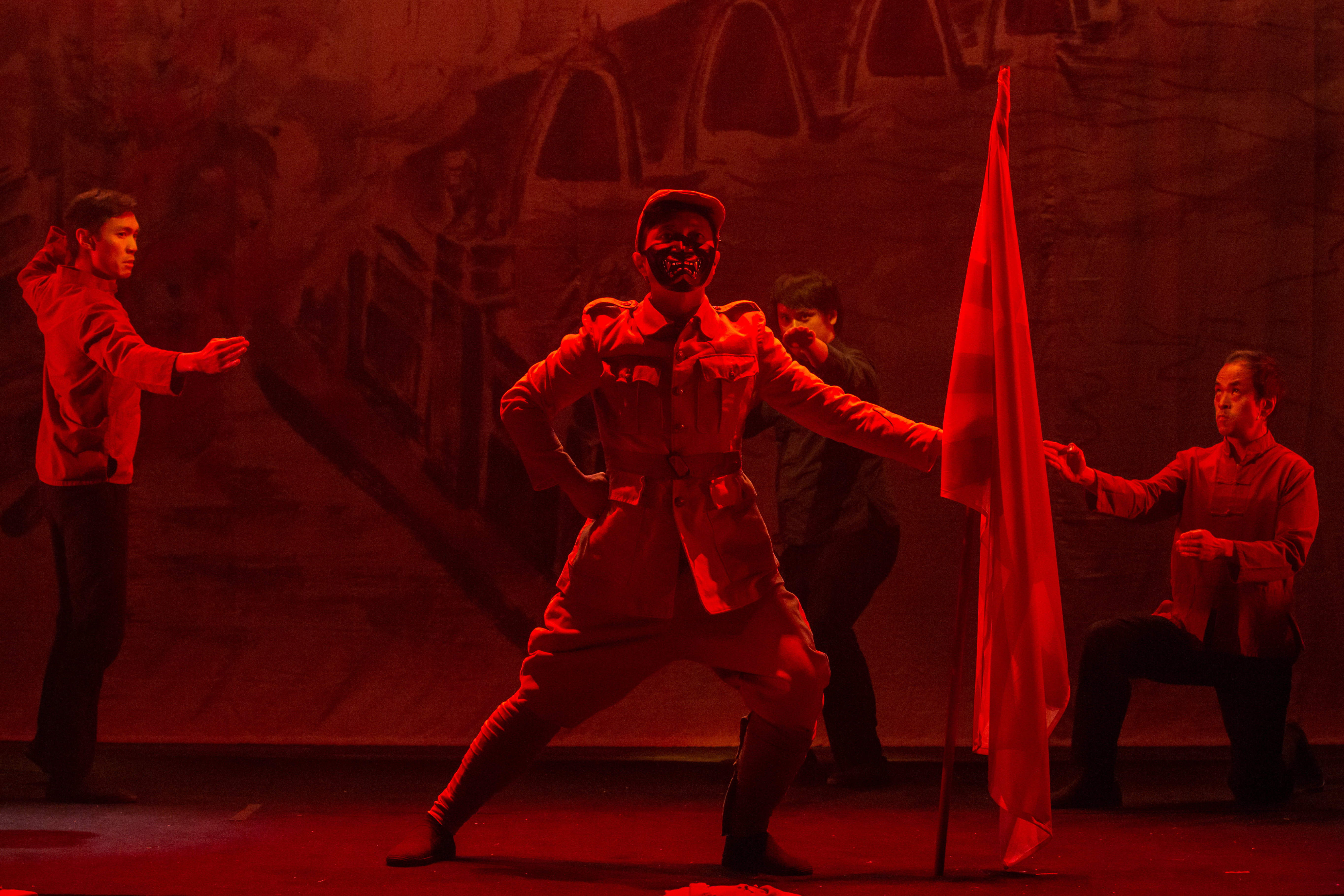 Gong Saang (Julian Wong) welcomed the audience to the performance and maintained a calm, even energy as his character tried to steer the other performers back on track within the play. Although there were moments where Wong seemed to forget his next lines, he remained in character and this was absorbed into the “play within a play” format. Egan Sun-Bin played the anxious and gentle Ah Faat, still recovering from the trauma of war in China. Jonathan Chan played Lihn Giht as gruff and suspicious, and Ming Yang Lim was expressive in the role of Waih Jai. Silvan Rus played Luhng Goh with intensity, especially in his leadership of the workers’ strikes and his moving reconciliation with Waih Jai in the final act.