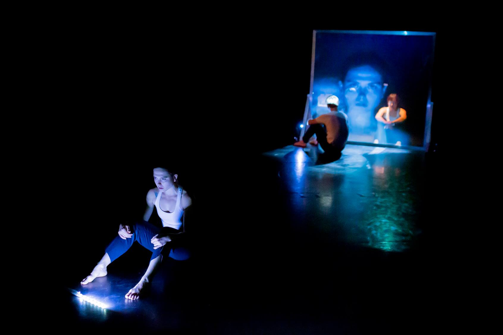 BUNKER explored the human response to fear and danger, but also our relationship to technology and to our own image. The performers danced with one another, with their shadows, and with projected images of themselves. BUNKER spoke directly to the audience through a voiceover, and words scrolling in red LED across the back wall told the story in second person, placing the audience more firmly in this scenario.