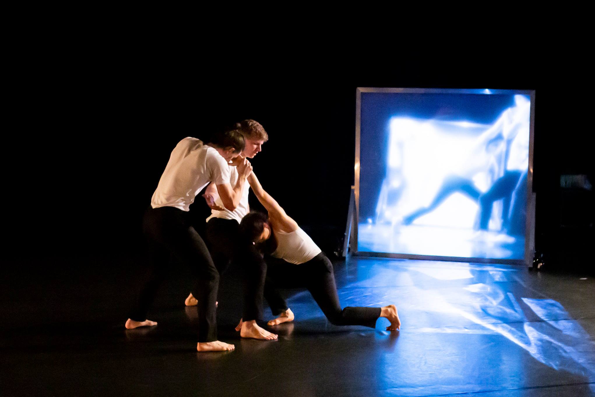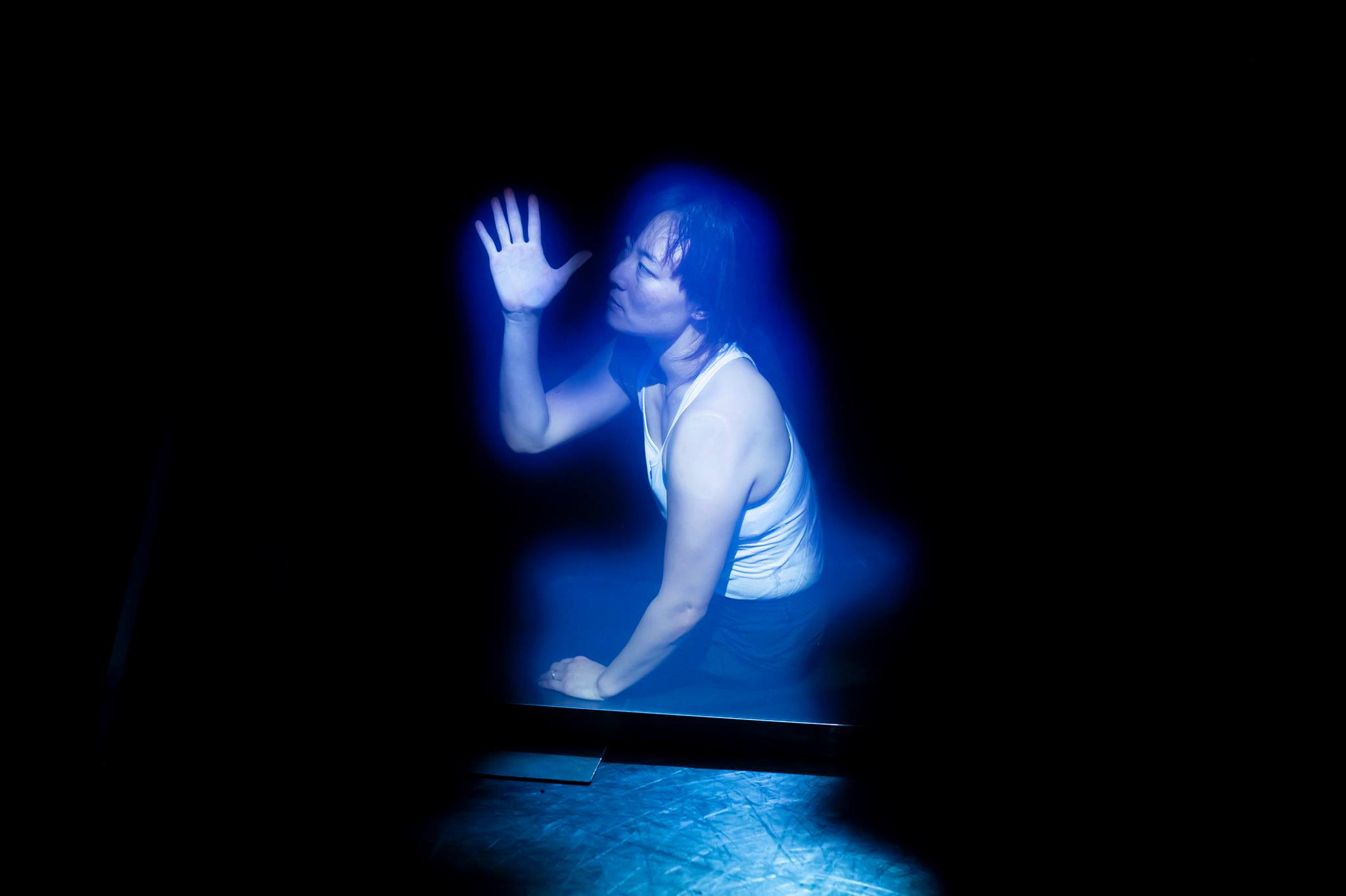 Group work, duets, and solo sections performed by the dancers intertwined with pre-recorded video design, live projections, and props and set pieces. The most memorable moments of the work were created in these intersections between physical and digital, both live and pre-recorded: the illusion of a performer’s body slowly dissipating into particles of light; an impassioned solo by Hsin-Ju Ely behind a clear panel at the rear of the stage, mimicking or interacting with a pre-recorded version of her own movements; a live feed of a performer slowly rearranging tiny furniture in a model house.