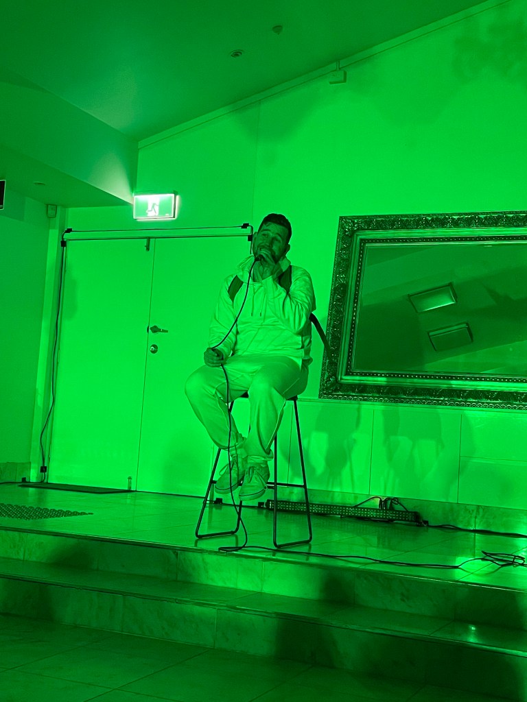 A voice modulator on Grehan’s handheld microphone varied the pitch of his voice throughout, although these distortions sometimes muffled his enunciation and made individual words difficult to distinguish. Dressed in a neutral-coloured tracksuit and sneakers, Grehan moved through the space while he performed, occasionally using a chair and sitting, standing, or lying on the stairs and the floor. Lighting bars produced intense, saturating colours and handheld lighting was also used effectively, especially when synchronised with the sound design in simulating use of a mobile phone.