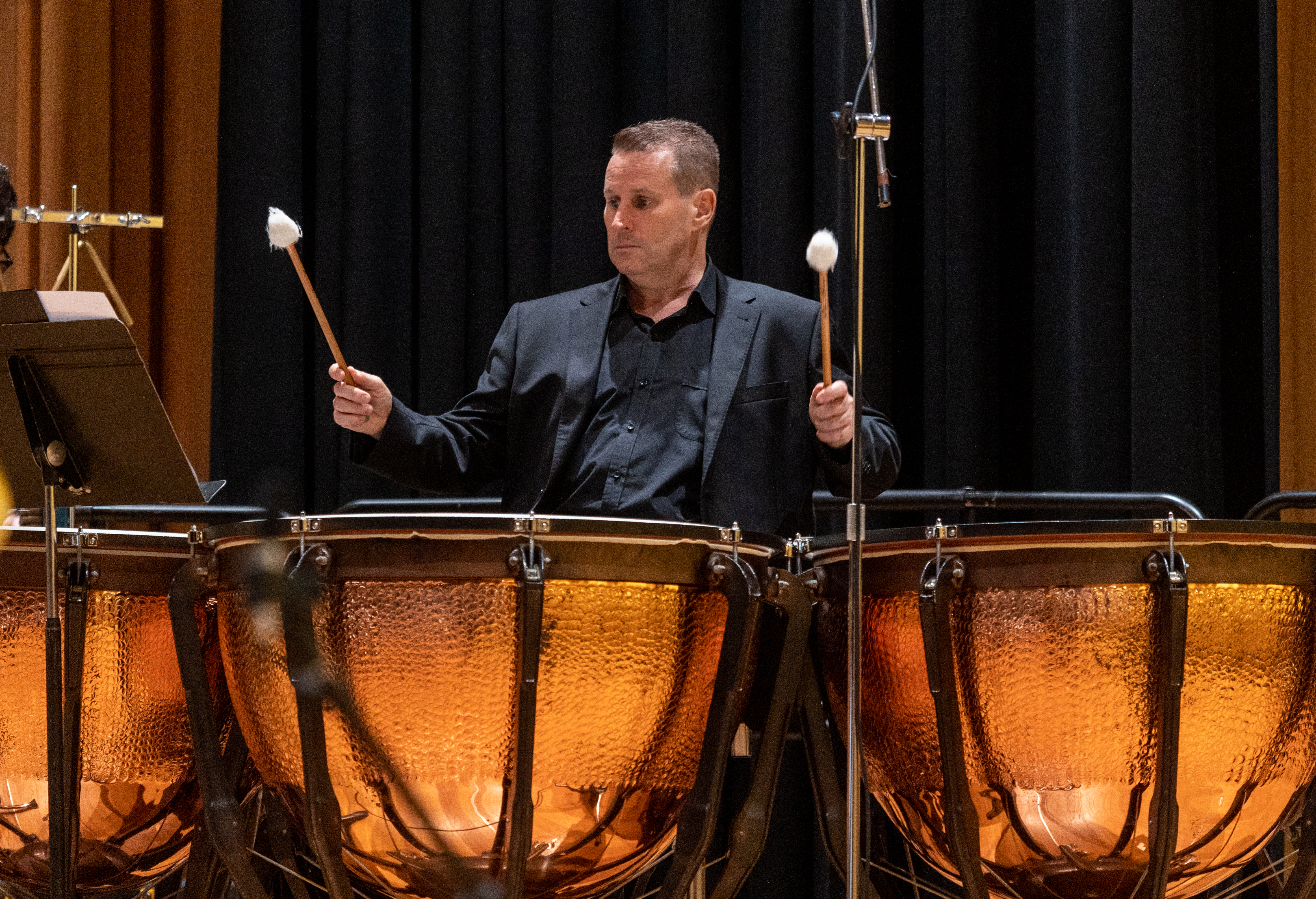 In direct contrast to the first, the second piece for Joy and Sorrow was performed only by brass and percussion musicians. Commissioned by the Queensland Symphony Orchestra, David Montgomery’s new composition Tenebrae and Passacaglia for Brass and Percussion featured solos for trumpet, horn, trombone, timpani, and percussion. The distributed arrangement of the musicians onstage also clearly showcased each section and musician.