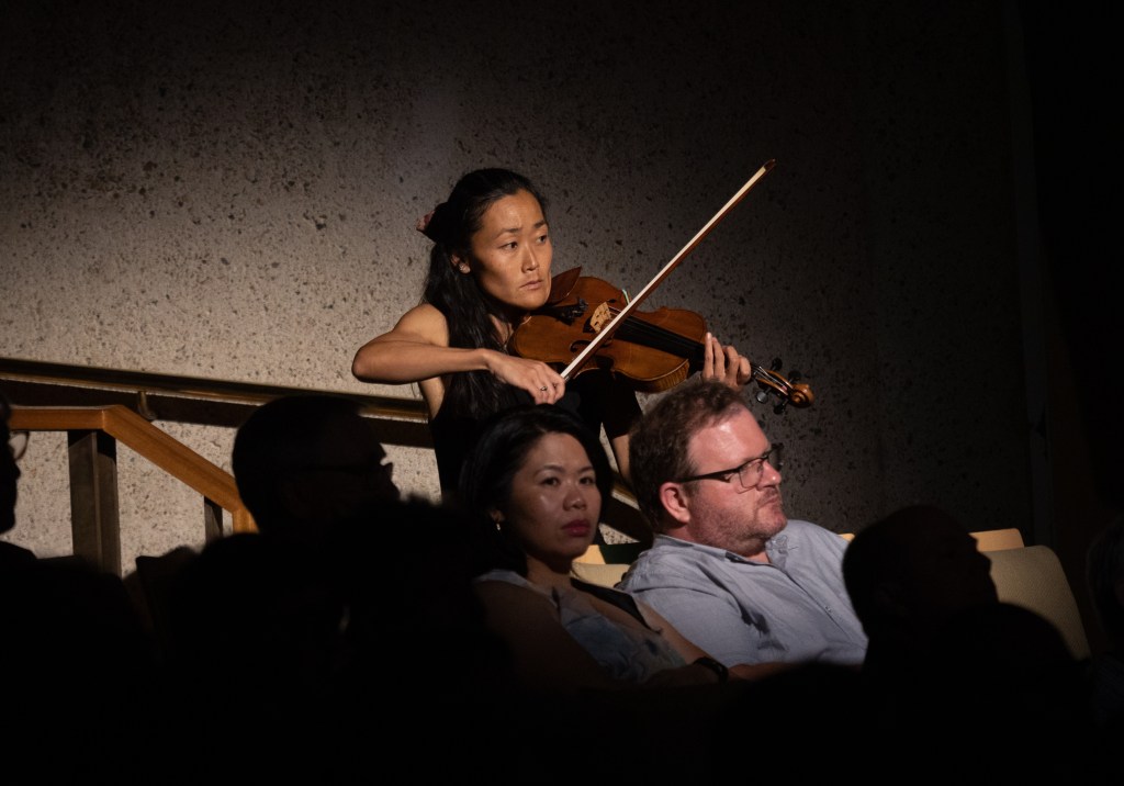 Serret’s vocals opened the piece slowly, like a sunrise, building to a crescendo before receding, calling to mind whistling wind and the hum of the earth. Both Barton and Serret vocalised and sang throughout, and Kalkani’s orchestral premiere was thrilling and intense.