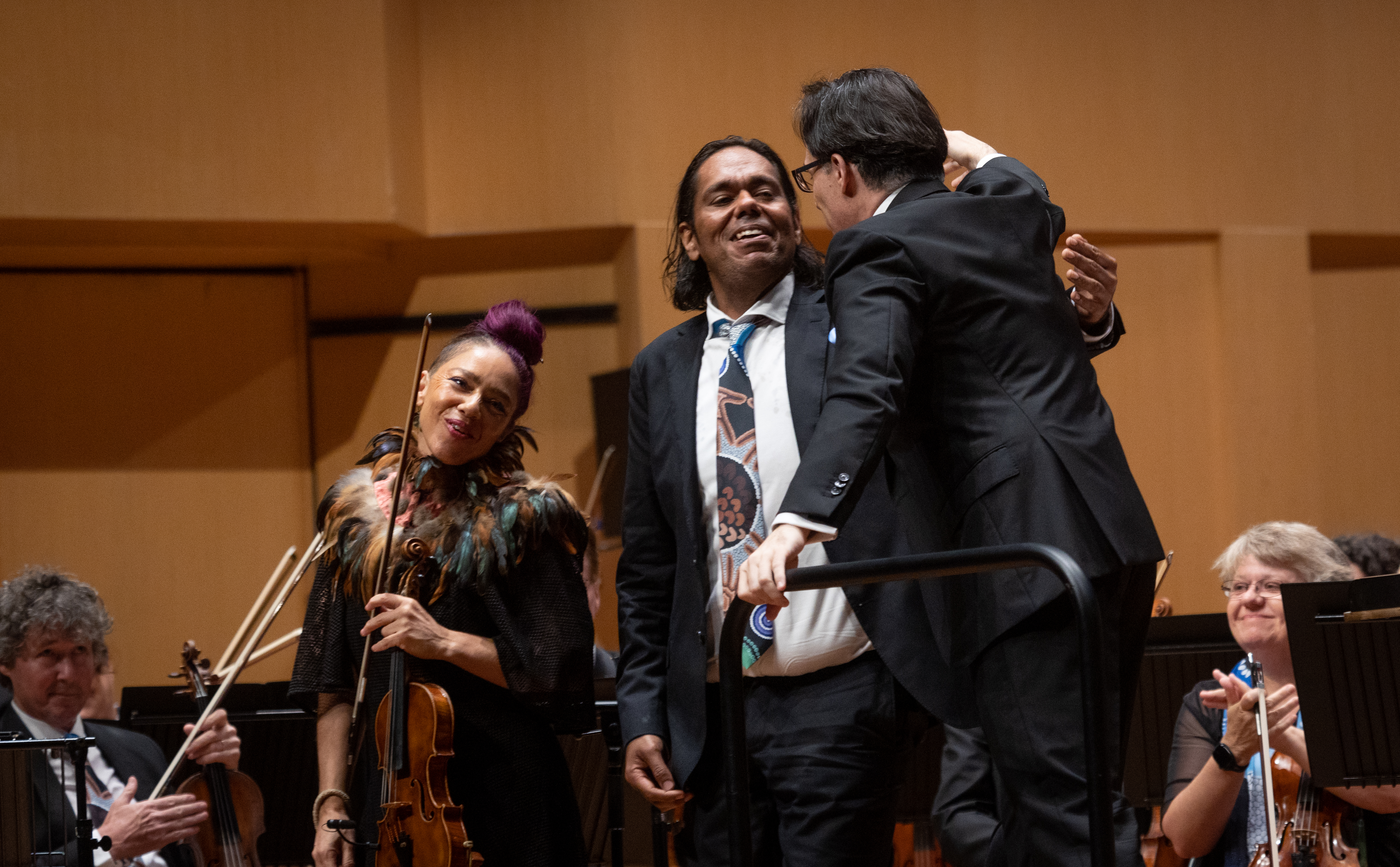 Queensland Symphony Orchestra hosted Kuku-Yalanji artist and musician Jeremy Donovan for a week-long residency in their South Bank studio late last year, culminating in an artwork titled Who We Are, which captures Donovan’s impression of “the essence of the Orchestra, its people and [QSO’s] place in beautiful Meanjin/Brisbane.” You may have noticed this striking painting in the background of the Joy and Sorrow concert photos, and sections of the artwork were printed on ties and scarves worn by the orchestra for Ode to Joy.