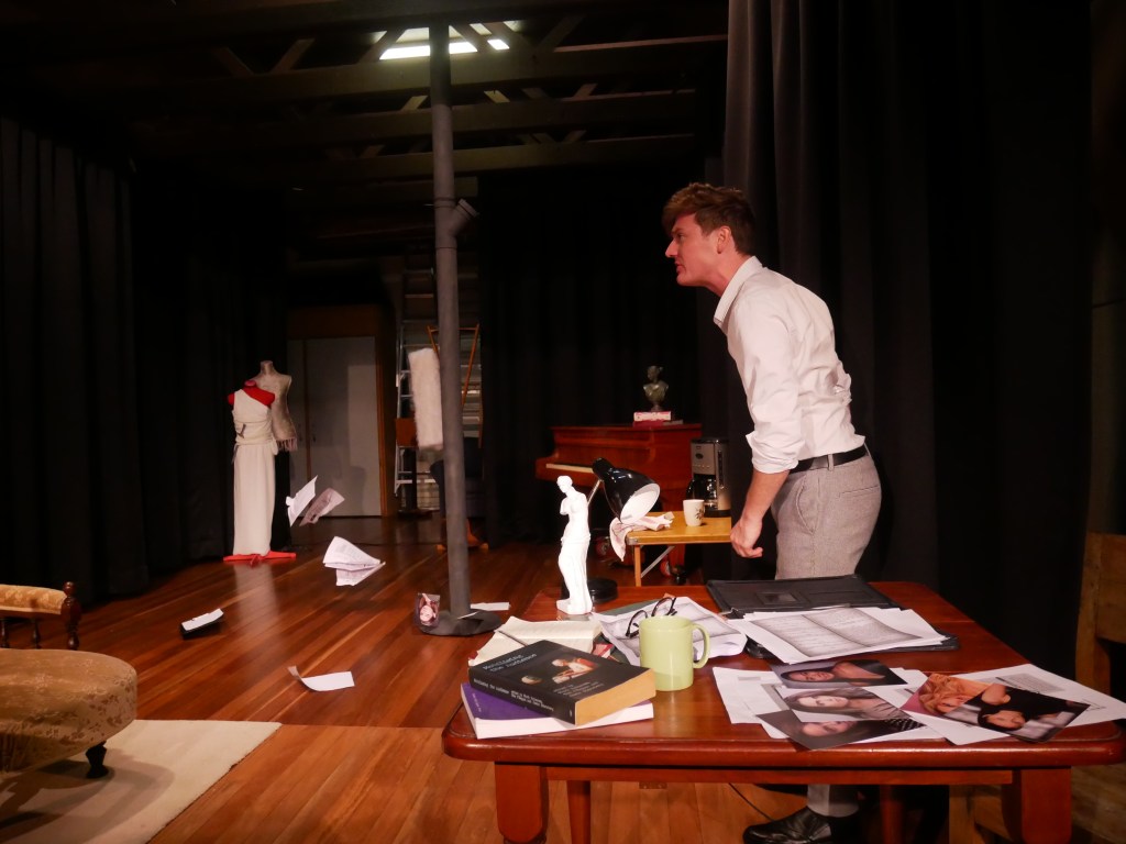 Set design by Brigitte Bennet made good use of the Latvian Community Hall’s deep stage and created the key spaces of the narrative. Changes in props and costume contributed to the blurring between reality and fantasy, and lighting design by Charlie Graham distinguished between the audition and the scenes being played out within it. Sound and lighting were also used to conjure the storm mentioned in the script, although the crashing thunder occasionally overpowered the actors’ voices early in the piece.