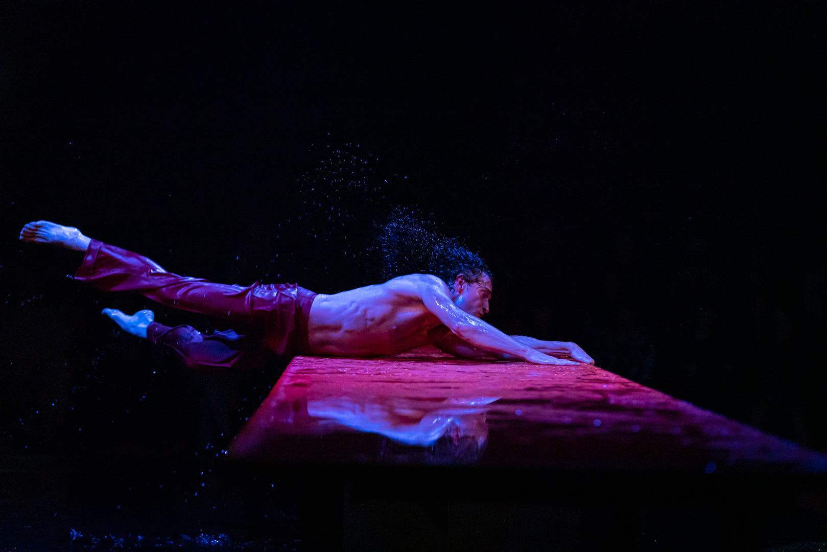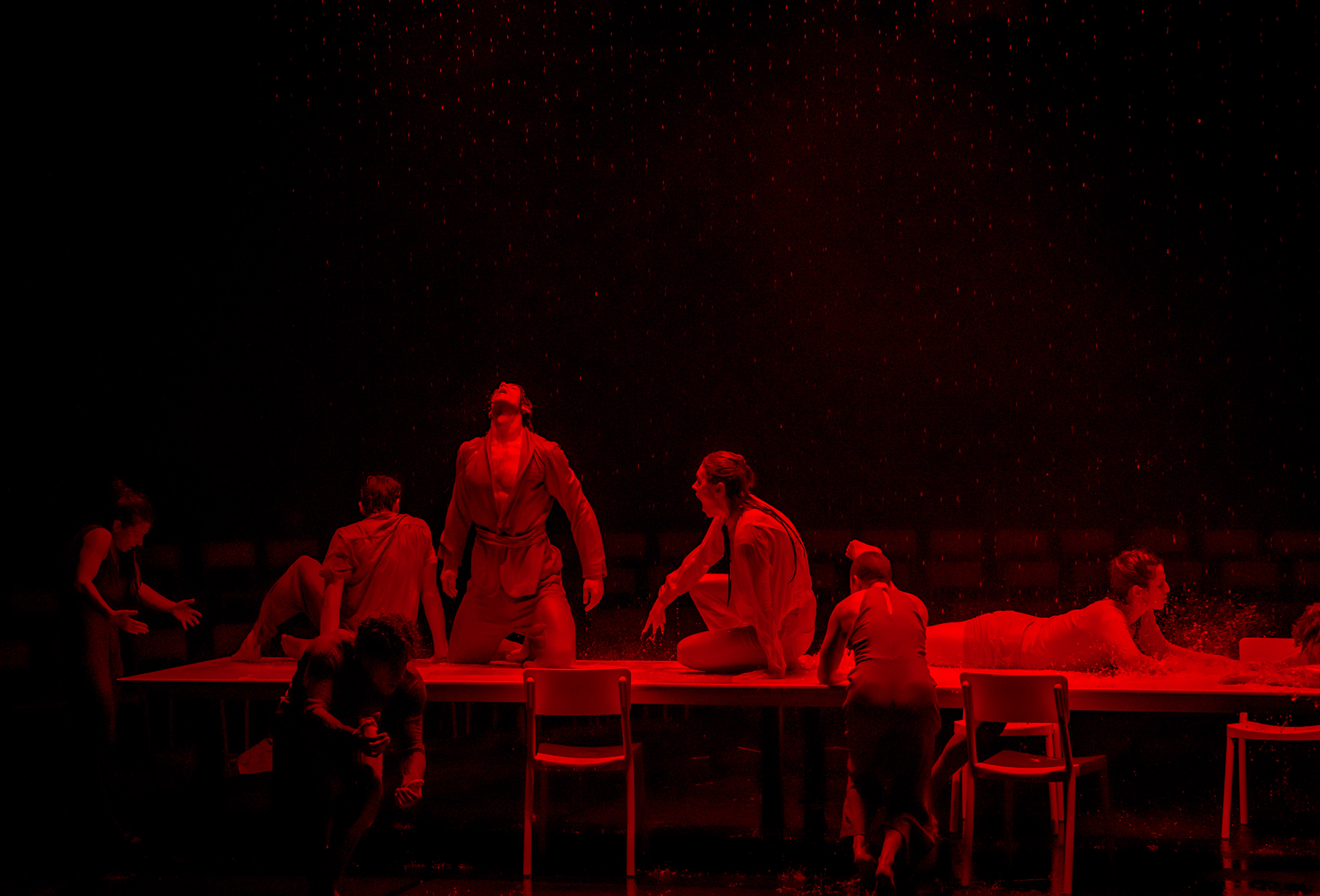 Director and choreographer Doyle wrote in her programme note that Salamander was inspired by J.G Ballard’s 1962 science fiction novel The Drowned World, considered one of the founding novels of the climate fiction sub-genre, and by the biblical last supper. I didn’t have that context going into the work, but nonetheless the imagery of a final meal, a climate emergency, and an increasingly unliveable earth were very clear. Water, time, death, and rebirth, all swirled through Salamander, and the name of the work was presumably taken from the giant reptiles that evolve in the apocalyptic conditions and prey upon humans in Ballard’s novel.