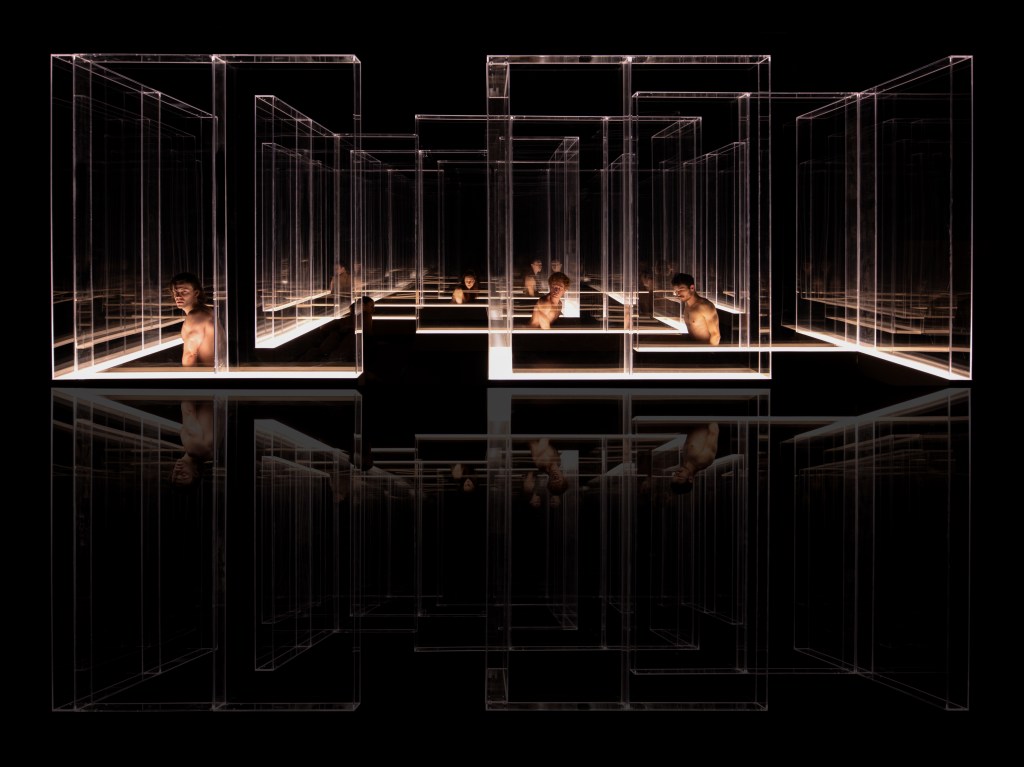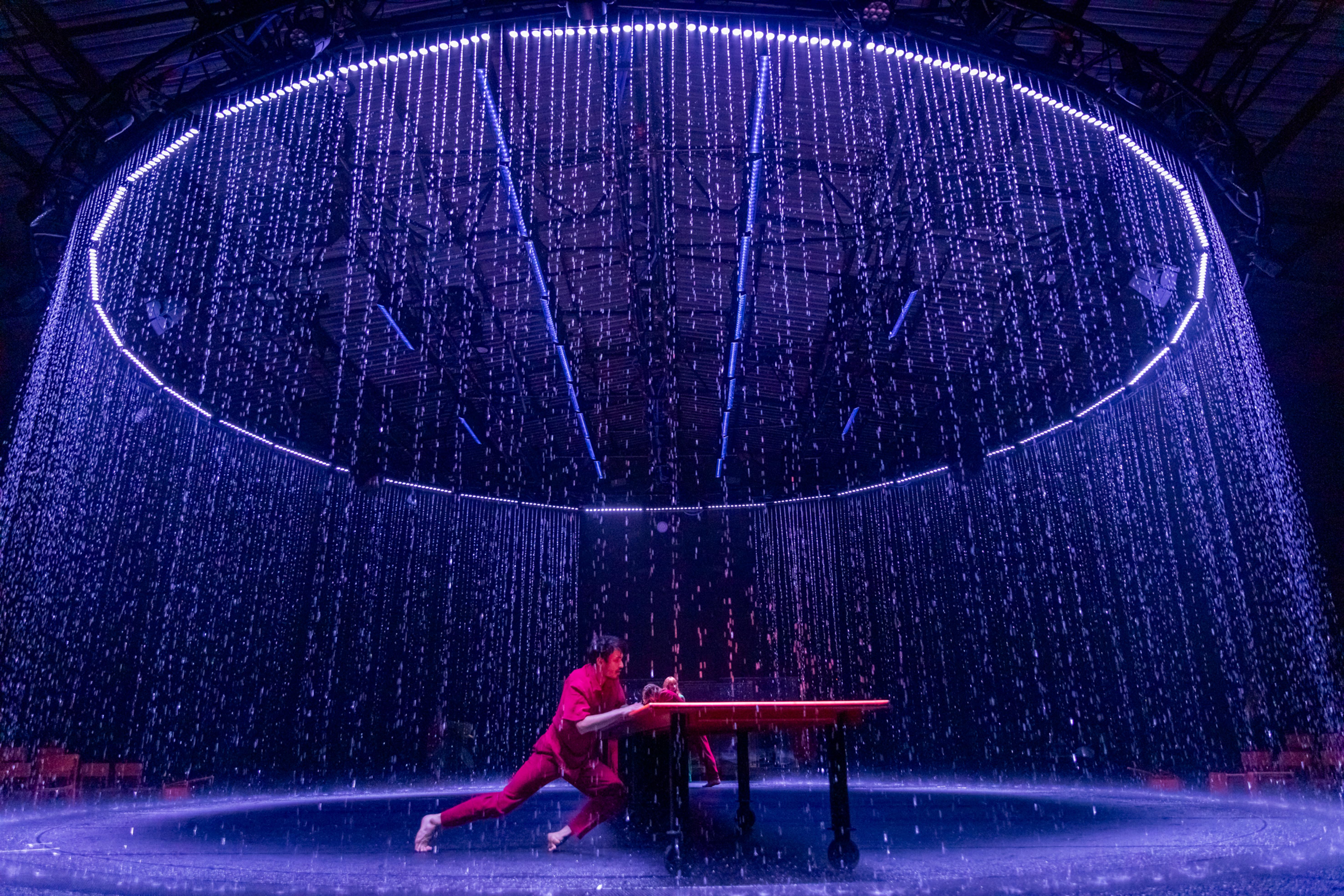 Installation artist and stage designer Es Devlin created the striking stage sculptures, including a transparent labyrinth surrounded by an inky moat of shallow water, and the kinetic set of the second performance space which featured an enormous spinning table and pouring rain that soaked the dancers and pooled on the stage.