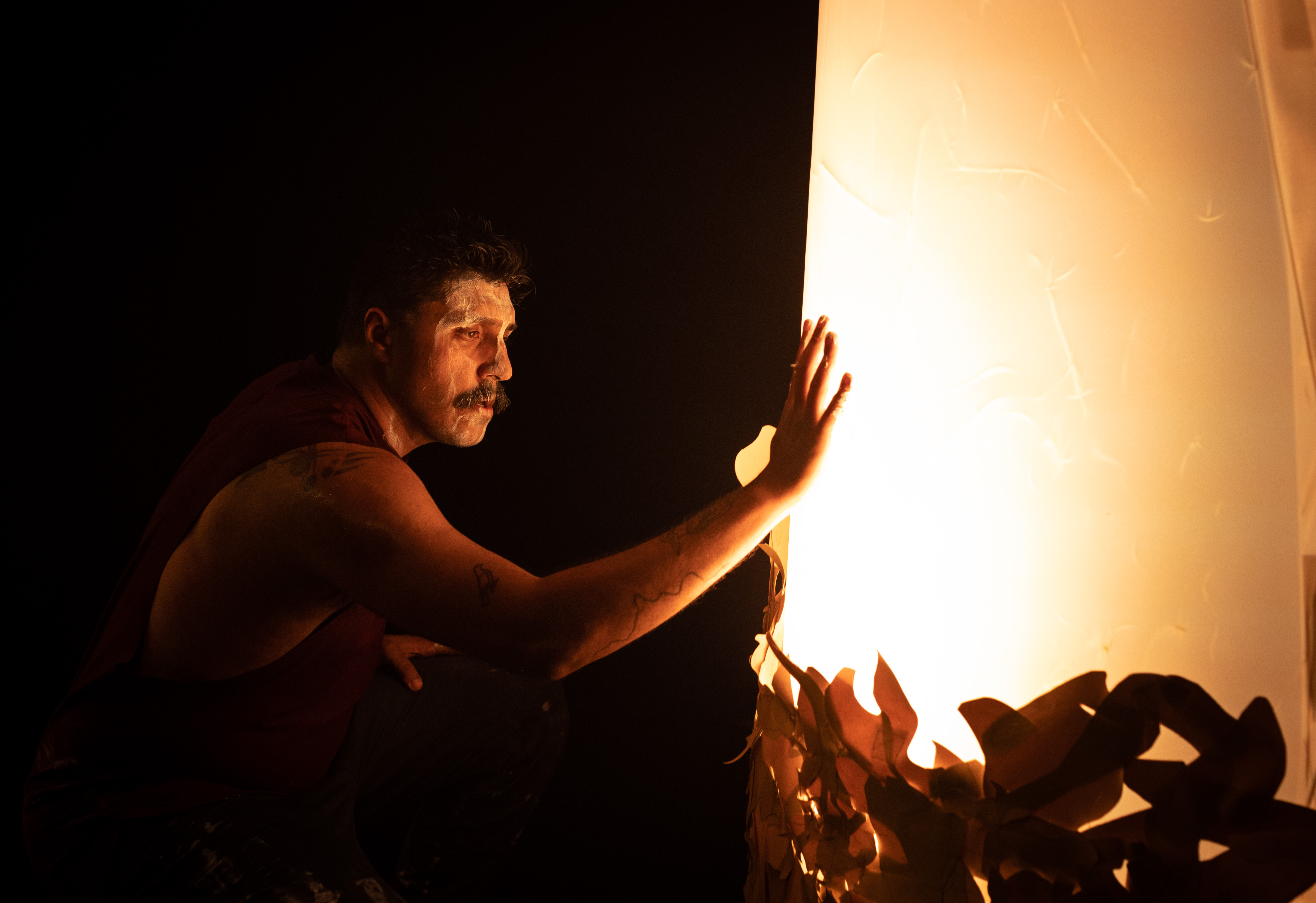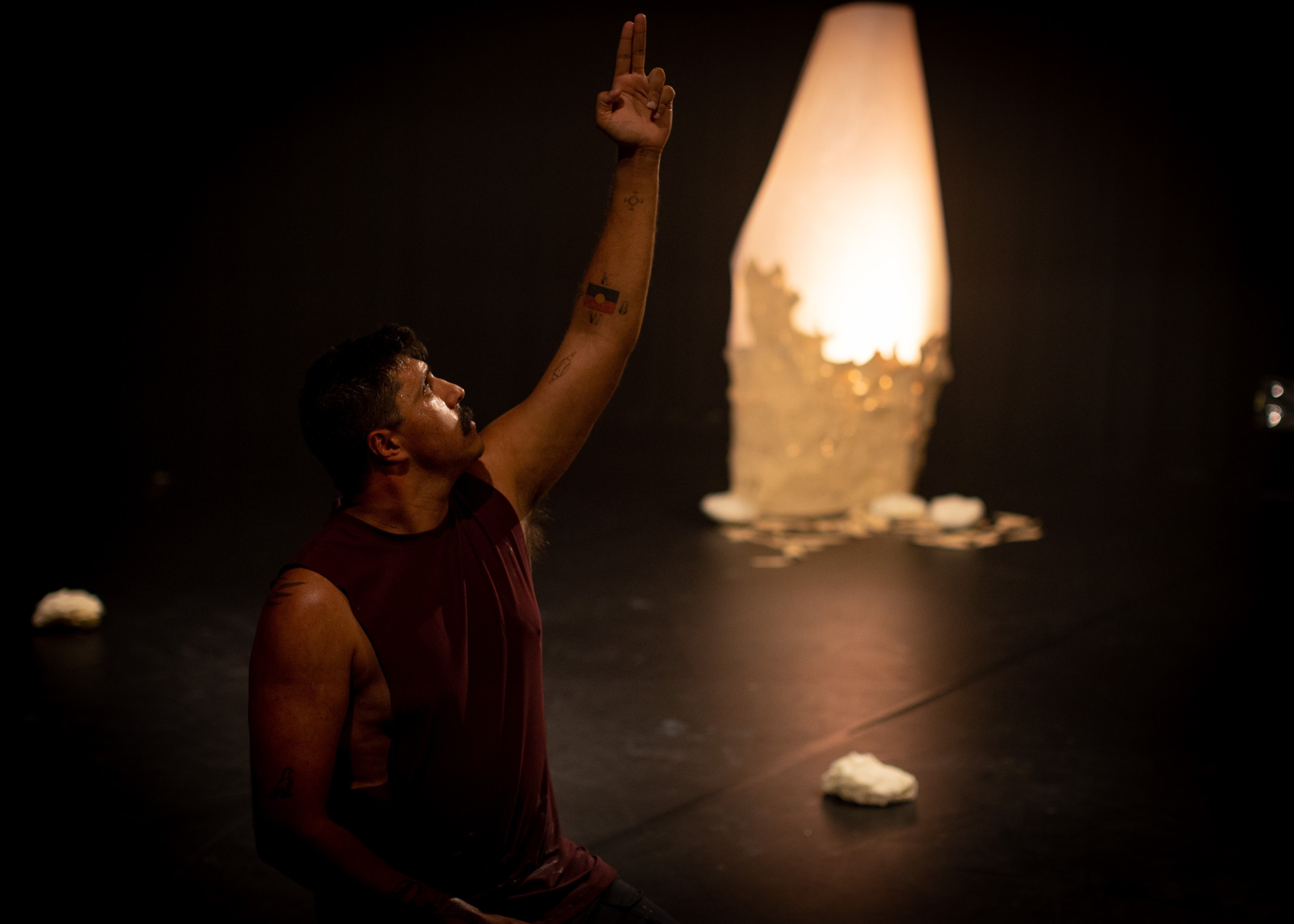 Kuramanunya was threaded with the narrative of a young man preparing for a ceremony in the present day. Although Kelly was alone on stage, he was often in conversation with an unseen older man, sometimes represented by a key set piece that resembled a huge tree. The tree also served to represent the branches of a family and the body as an extension of country.