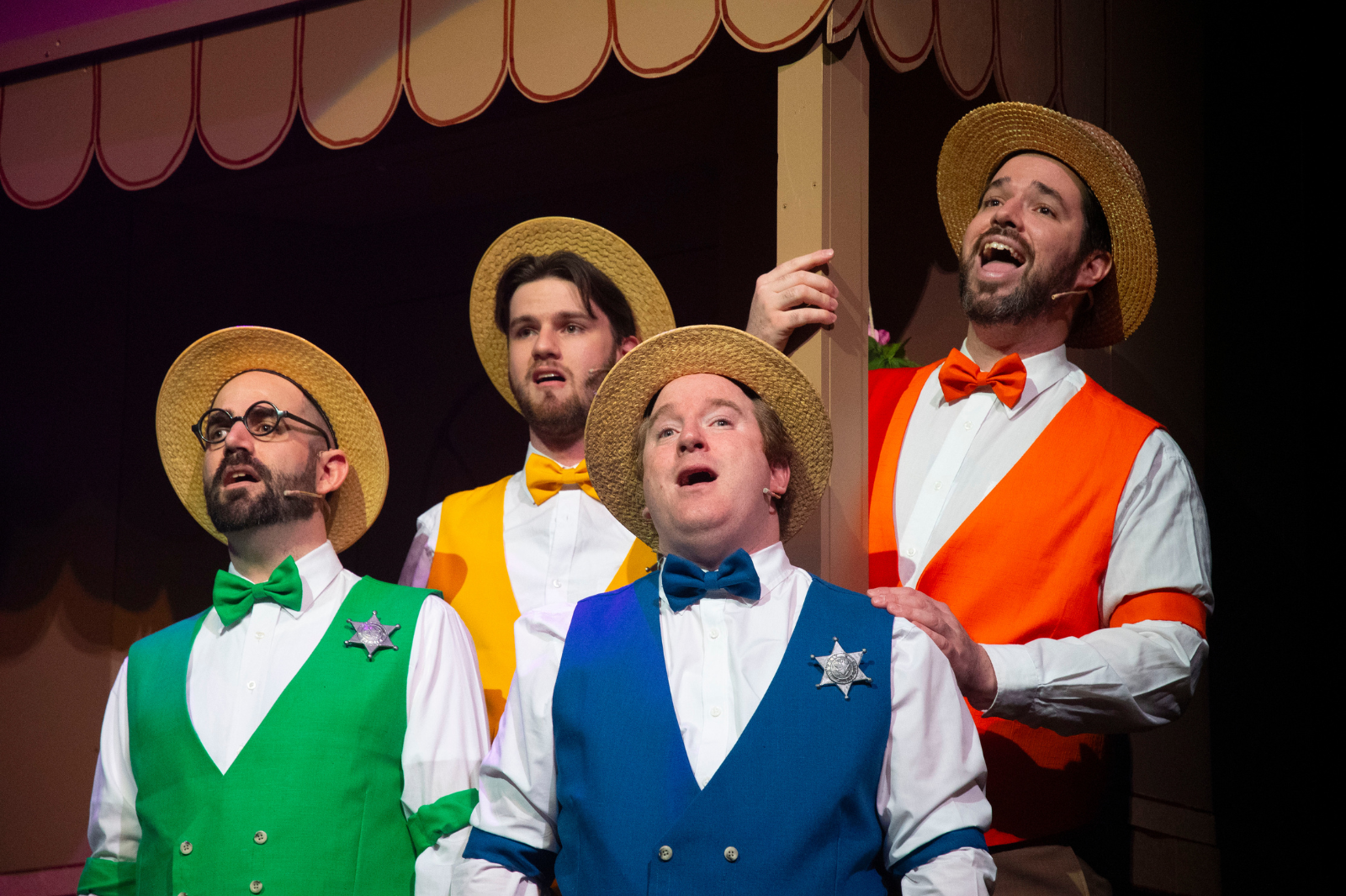 Ewart Dunlop (James Riley), Jacey Squires (Jordan Ross), Olin Britt (Patrick Bischoff) and Oliver Hix (Douglas Berry) were also slowly transformed, from quarrelling members of the school board into a harmonious barbershop quartet. I loved the way that a new detail was added to their costumes, with each character wearing a distinct colour, each time they appeared onstage thereafter.