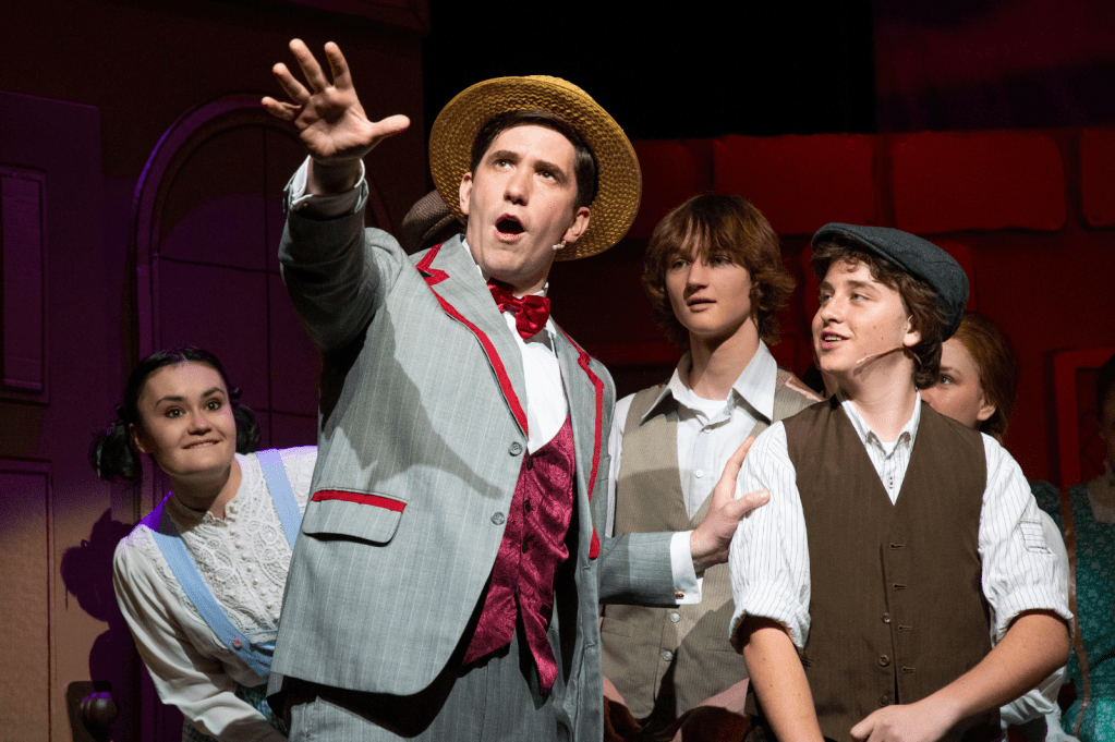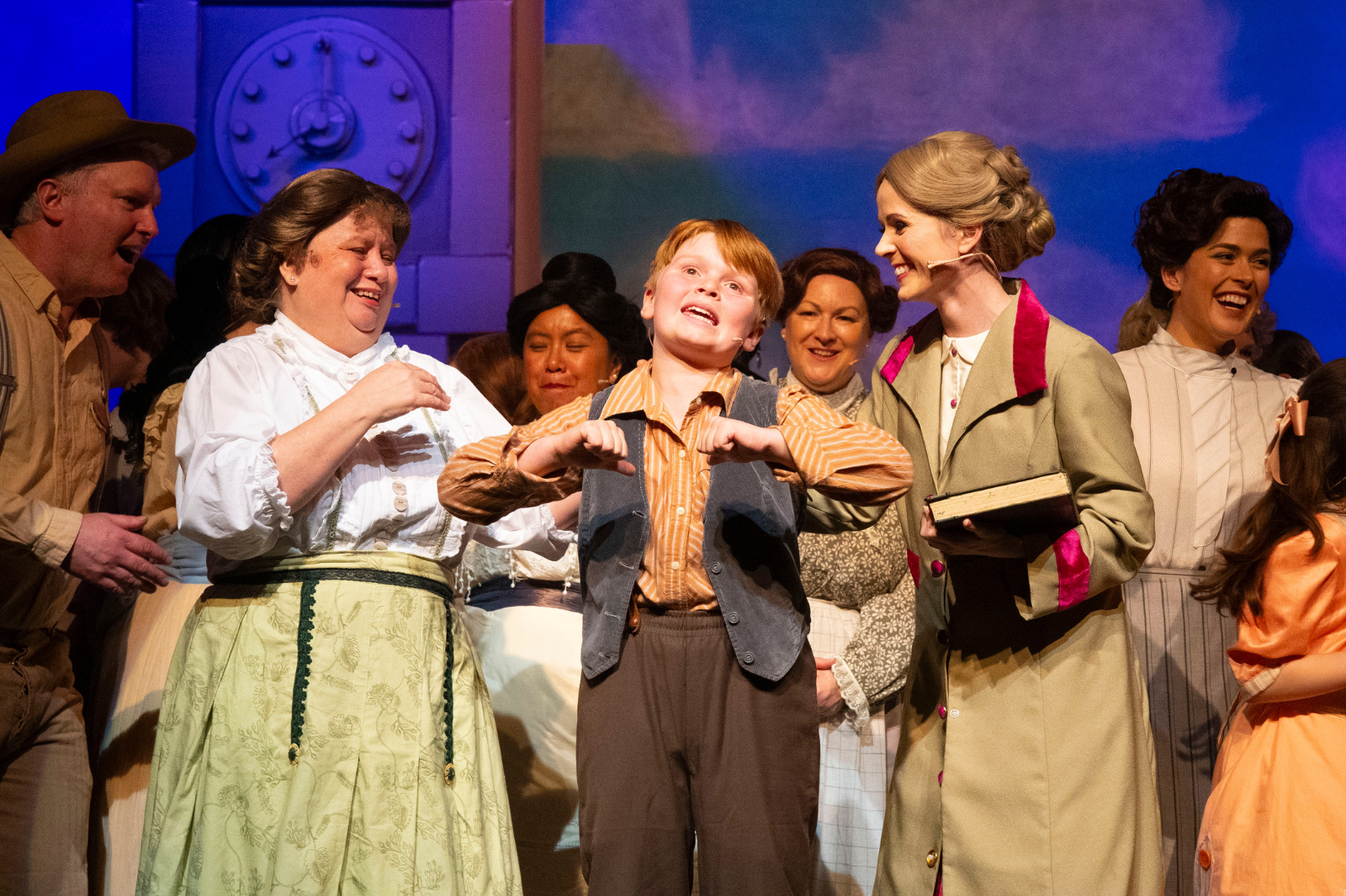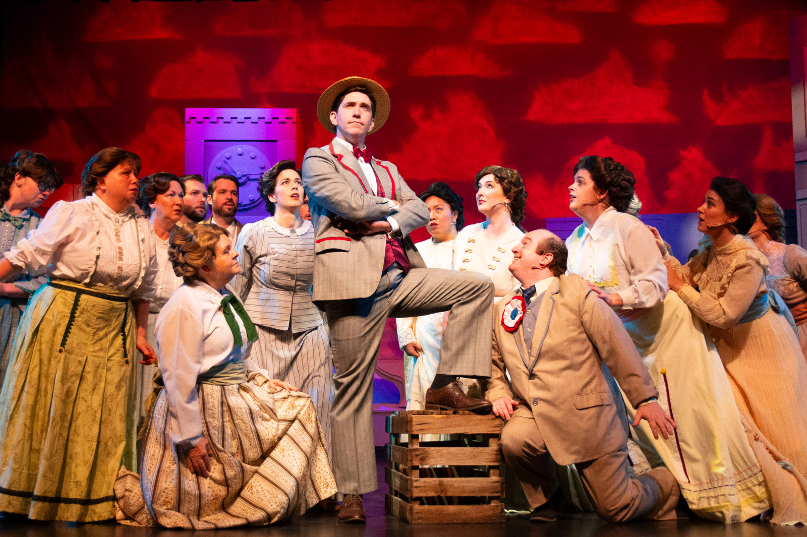 Harold (David West) arrives in River City, Iowa, in the summer of 1912 and convinces most of the townsfolk that a recently installed pool table is at risk of corrupting their children. He urges them to invest in the formation of a band, and they agree. However, local librarian and piano teacher Marian Paroo (Amy Winner), with whom Harold inevitably falls in love, remains suspicious of his motives. As with many older musicals, there are plot points that felt uncomfortable in the modern era, like Harold’s relentless romantic pursuit of Marian despite her protests.