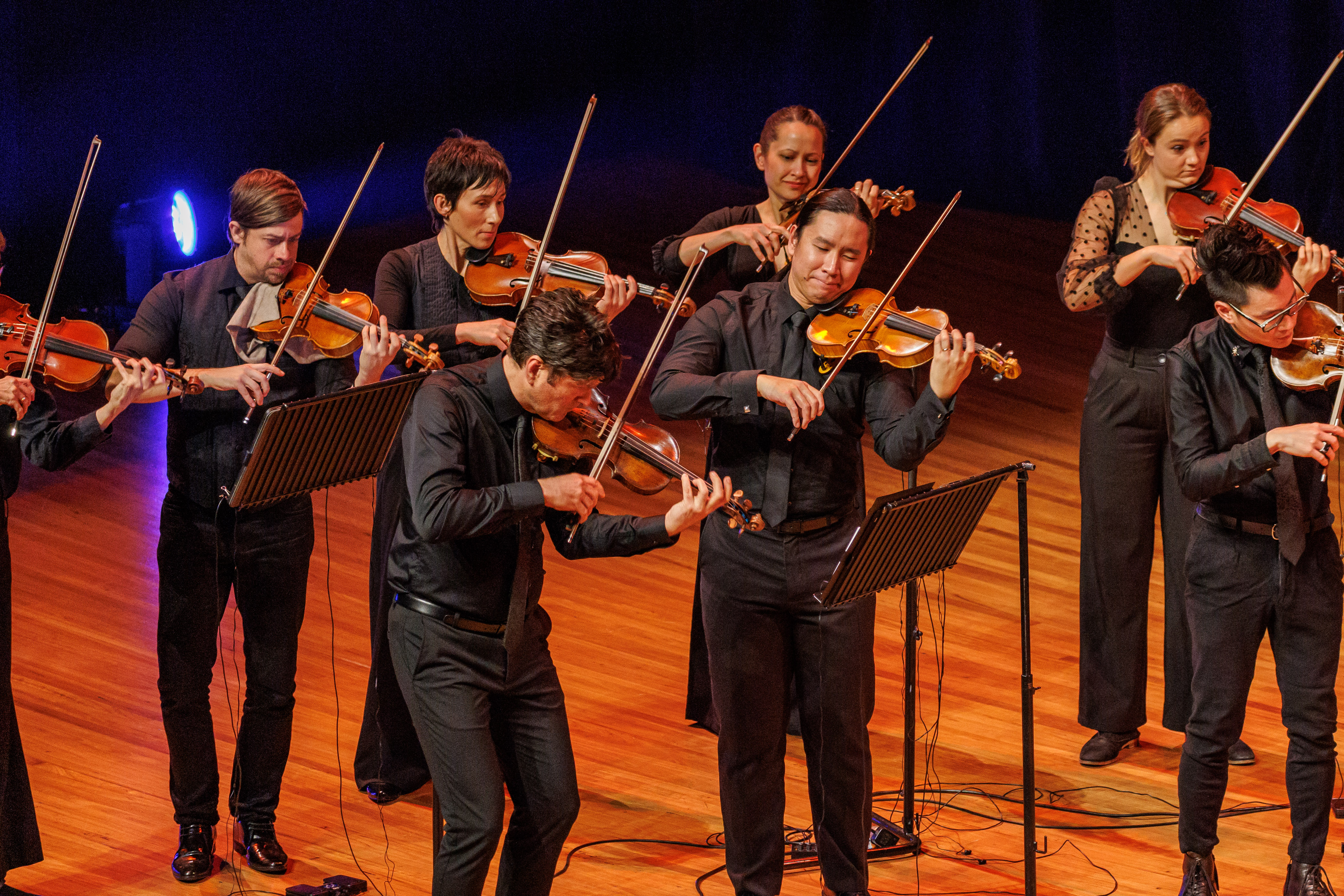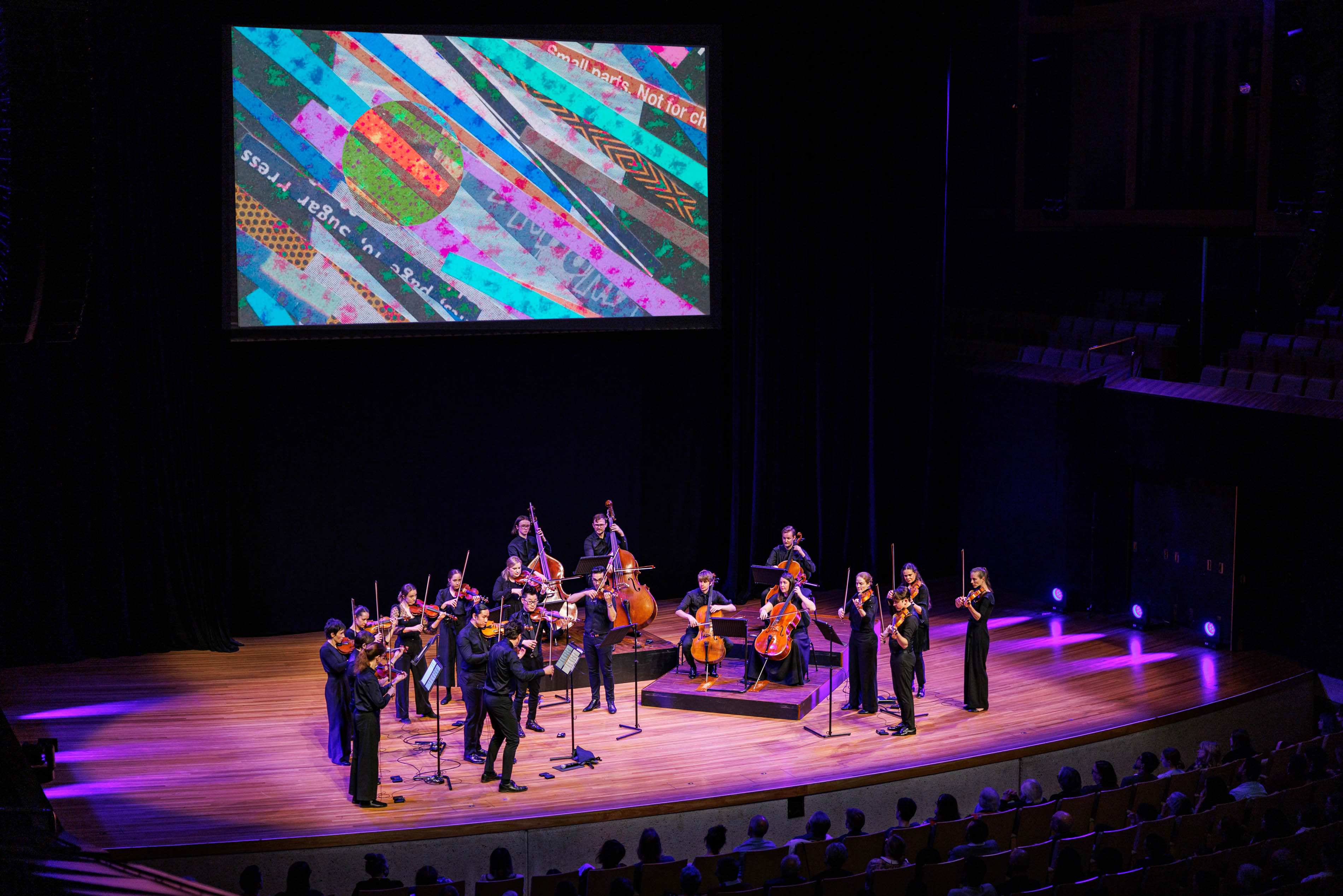 Following the Holberg Suite, Camerata principal violinist Jonny Ng introduced the first three films. The curtains behind the musicians parted and a huge screen came into view, showing Lucas’ short films as the musicians played the accompanying piece of music. Lighting designed by Zak Harrison also shifted throughout, setting the tone for each new work.