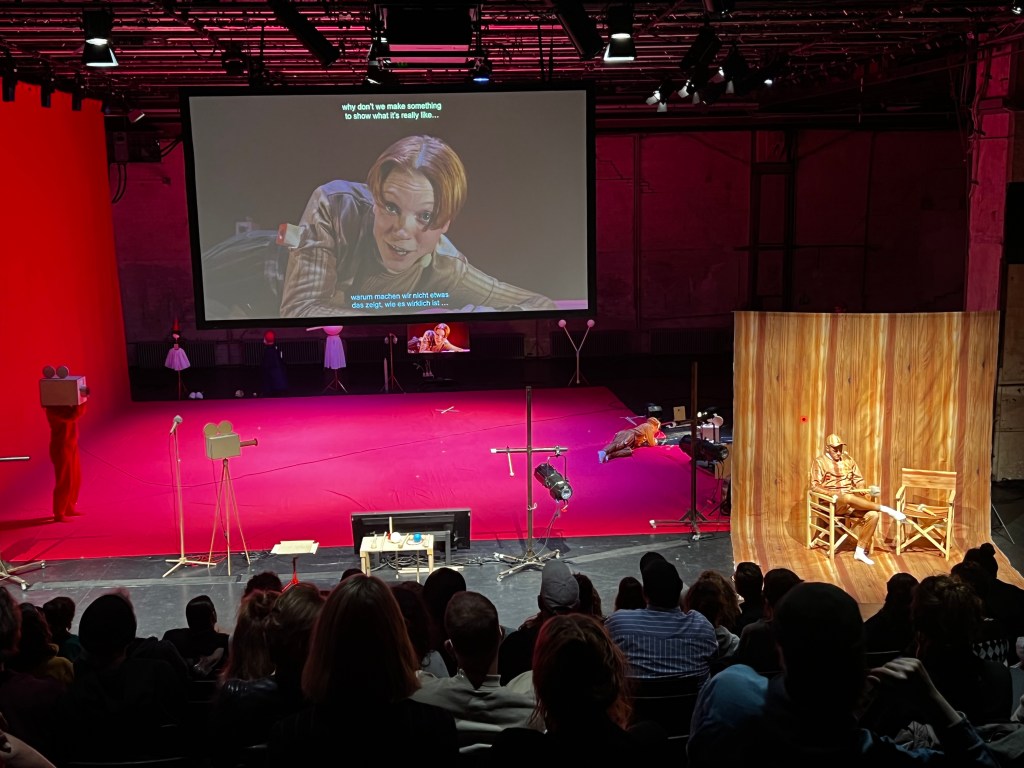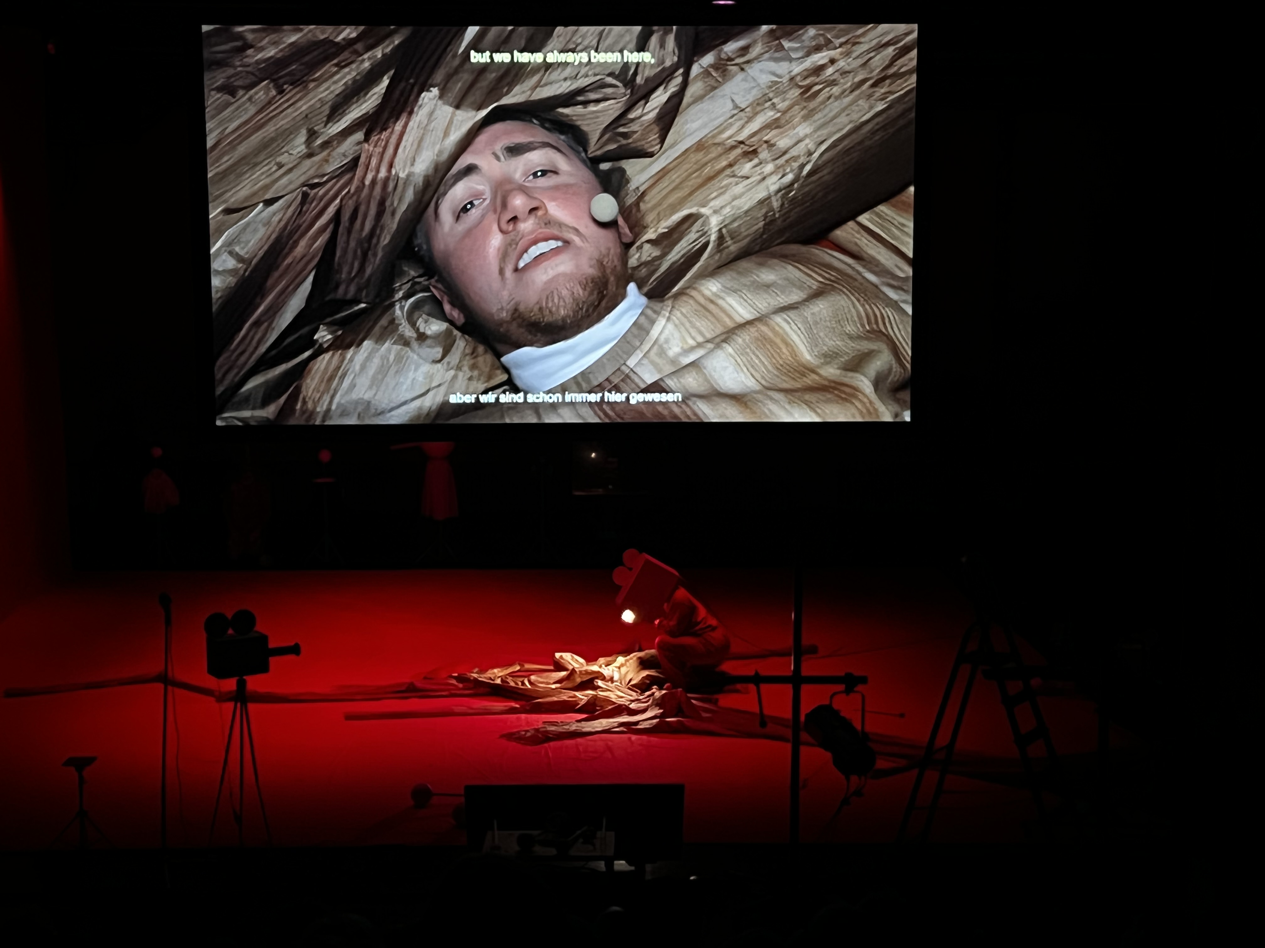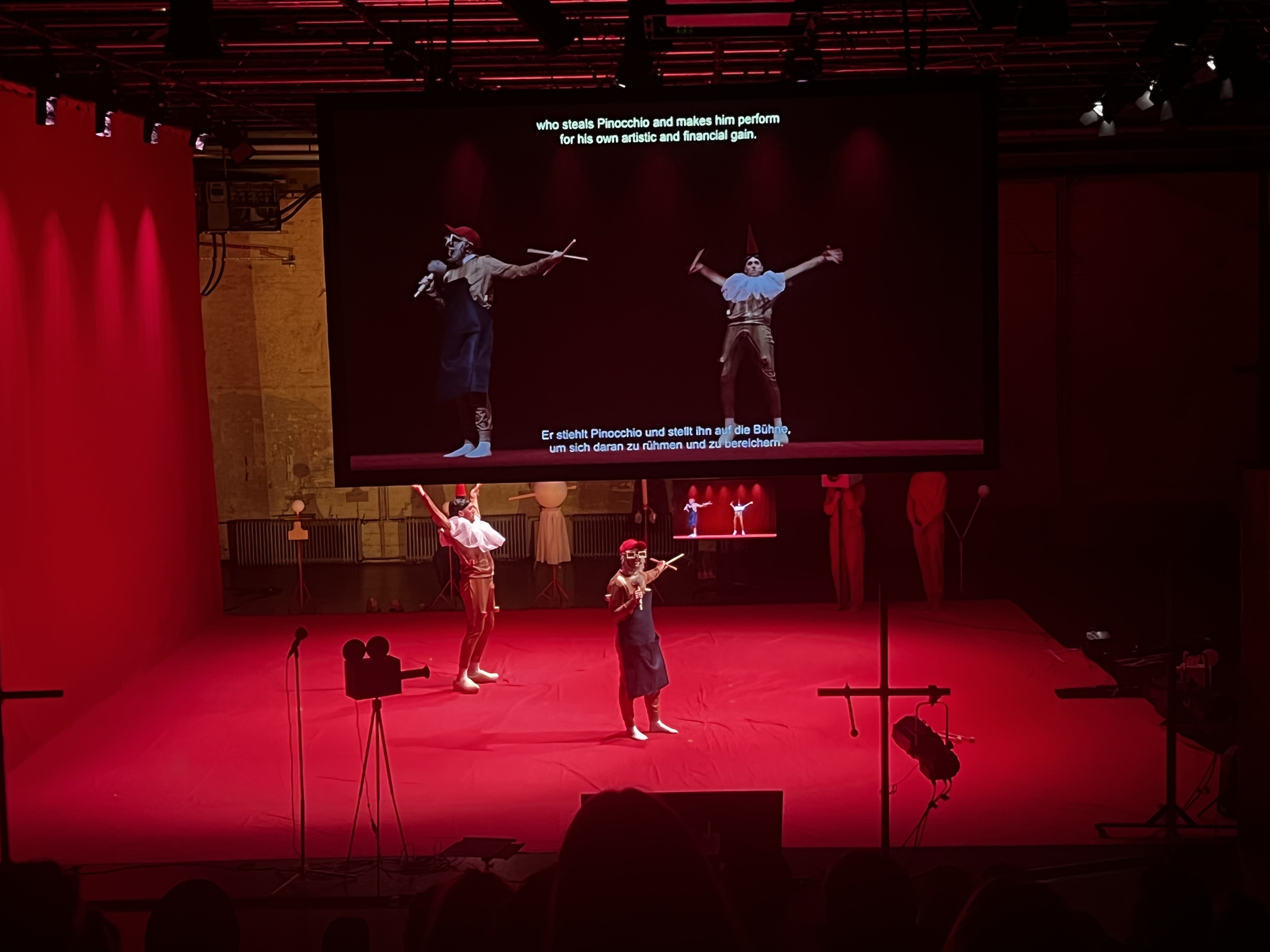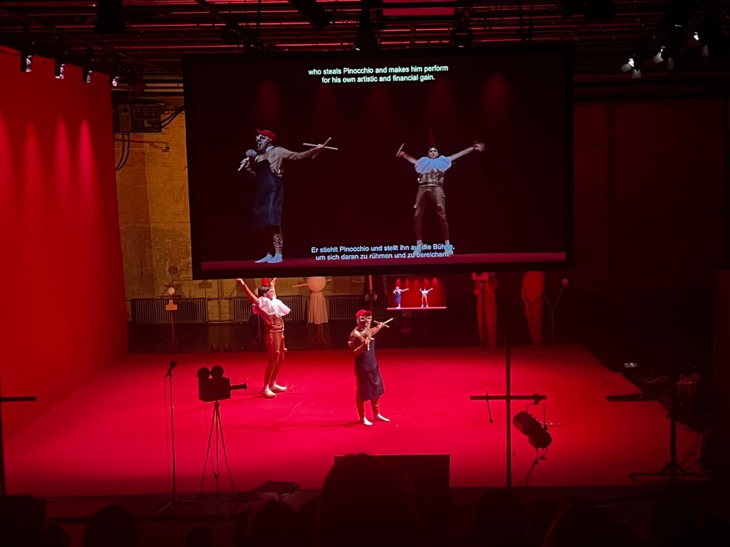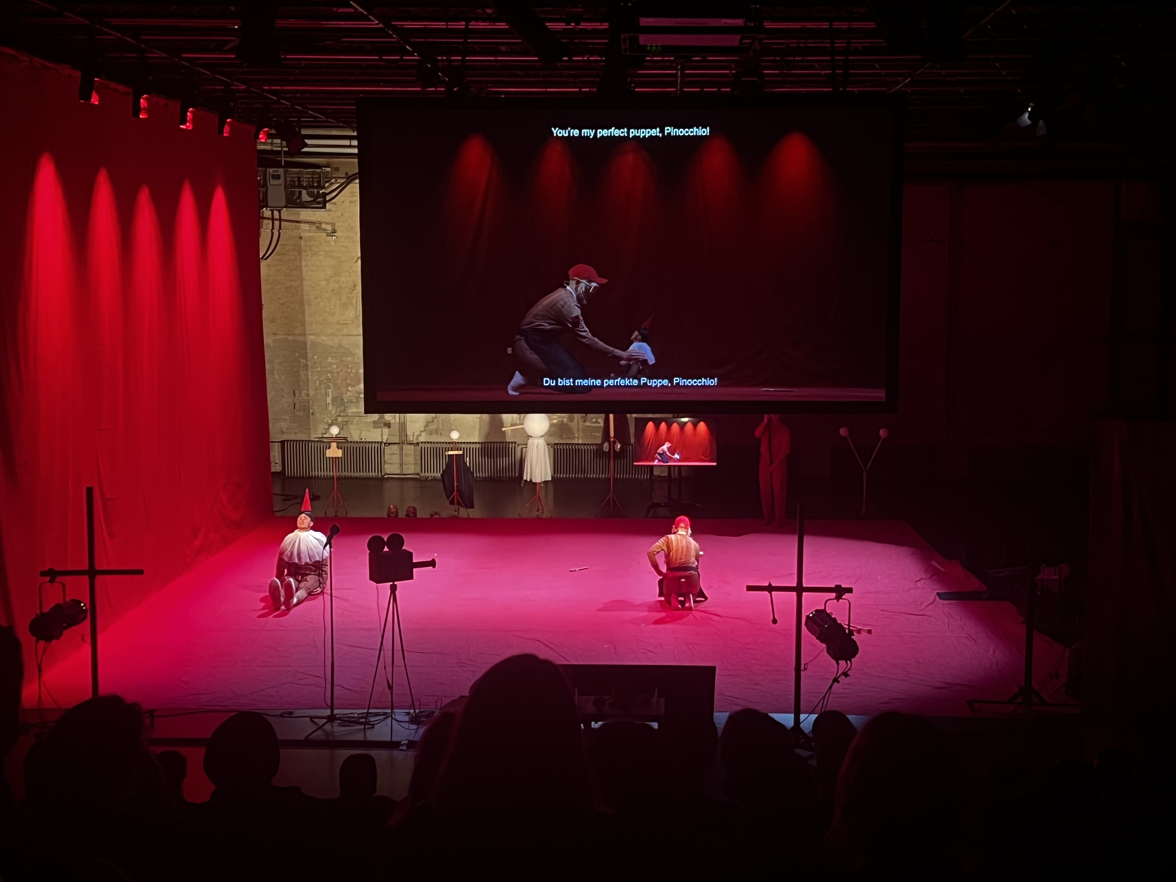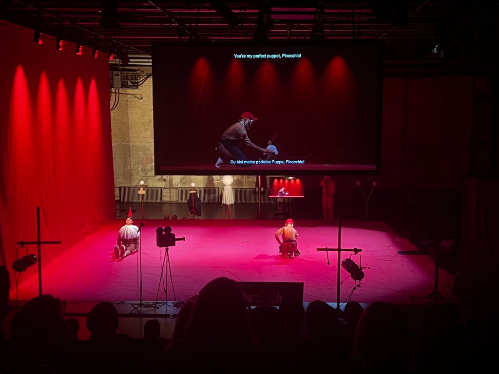 The theatrical and filmic elements of the show were completely intertwined; camera feeds from different angles, which could be seen across a number of screens on and around the stage, allowed for these shifts in perspective. There was an element of metatheatre to the performance, presenting the show as a work in development. Ivor and Rosana spoke to each other, and to the audience, in addition to playing out the story of Pinocchio in character.
