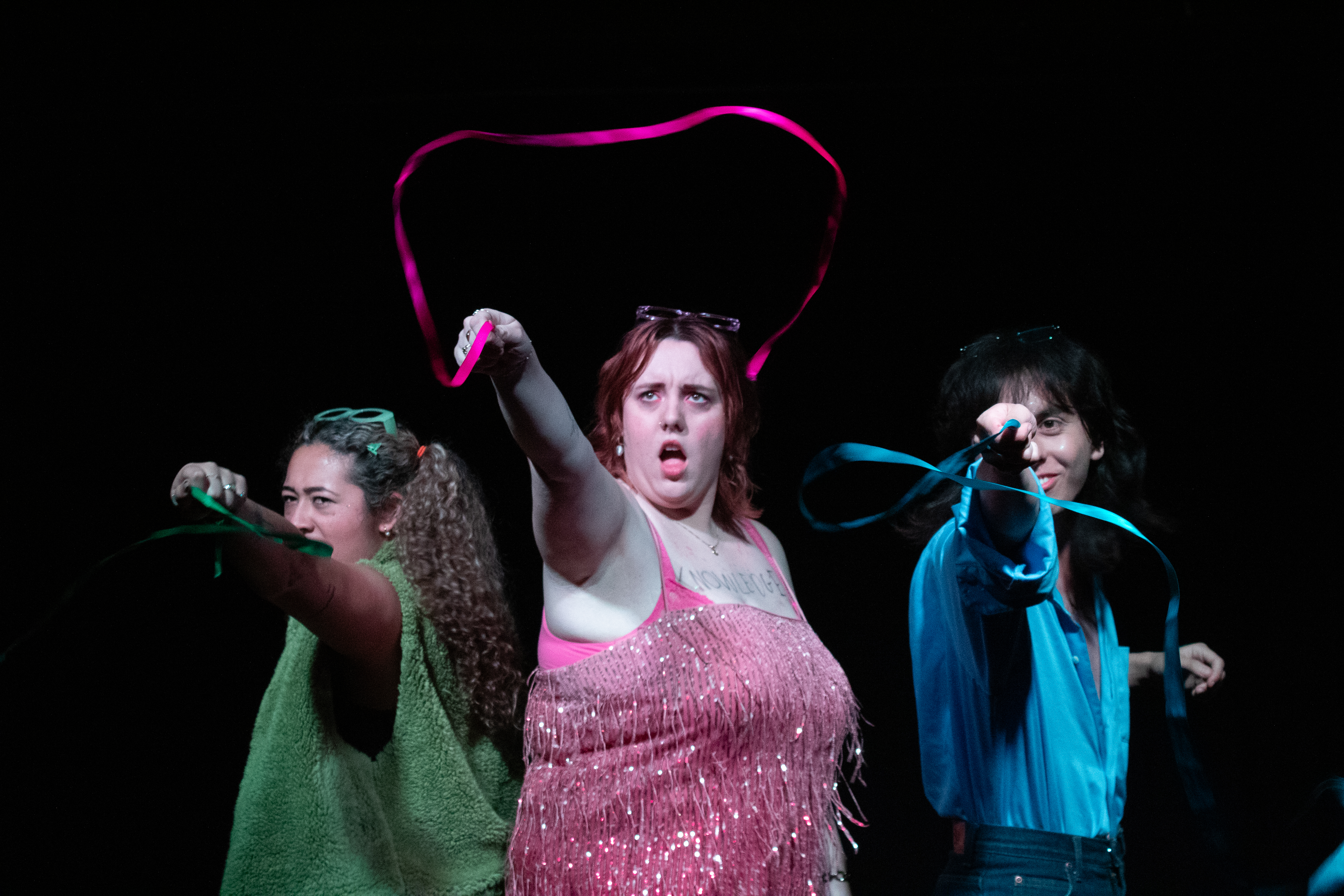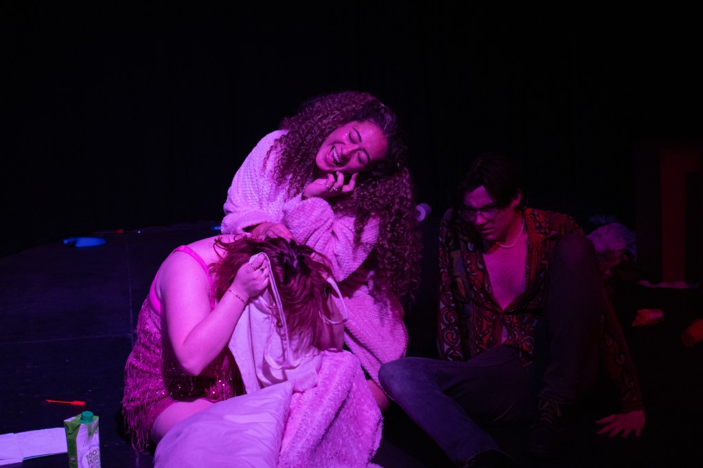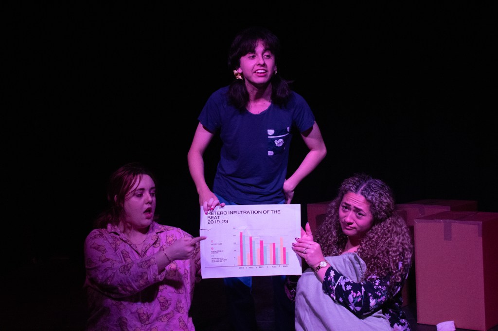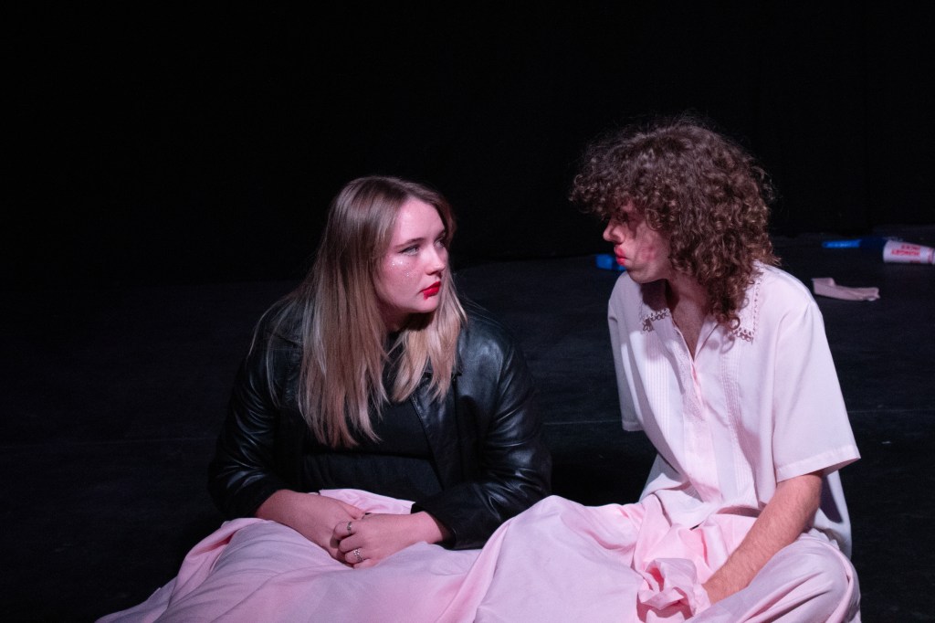PASHUN opened with each character responding to a series of unheard survey questions about love, setting the tone of their character for the rest of the work. Tiff (Zara Chandler) is desperate for a date with Rory (Ewan Robertson) and laments the difficulty of being a straight girl in a gay world to her queer best friends Kai (Cullyn Beckton) and Emma (Naticia Slade). Meanwhile, Rory’s twin sister Lena (Rachael Woodnett) is having a relationship with Conner (Keegan Bell) in one-minute increments, and Conner’s friend Andrew (Scott Kift) is being drawn into increasingly dehumanising shenanigans by his landlord/housemate SIGMA (Emma Stratton), an Andrew-Tate-esque vlogger and self-styled alpha male masculinity expert. All of the actors played their characters believably, and Stratton’s exaggerated characterisation of Sigma was a comic highlight. Importantly, the actors seemed to be having fun as well.