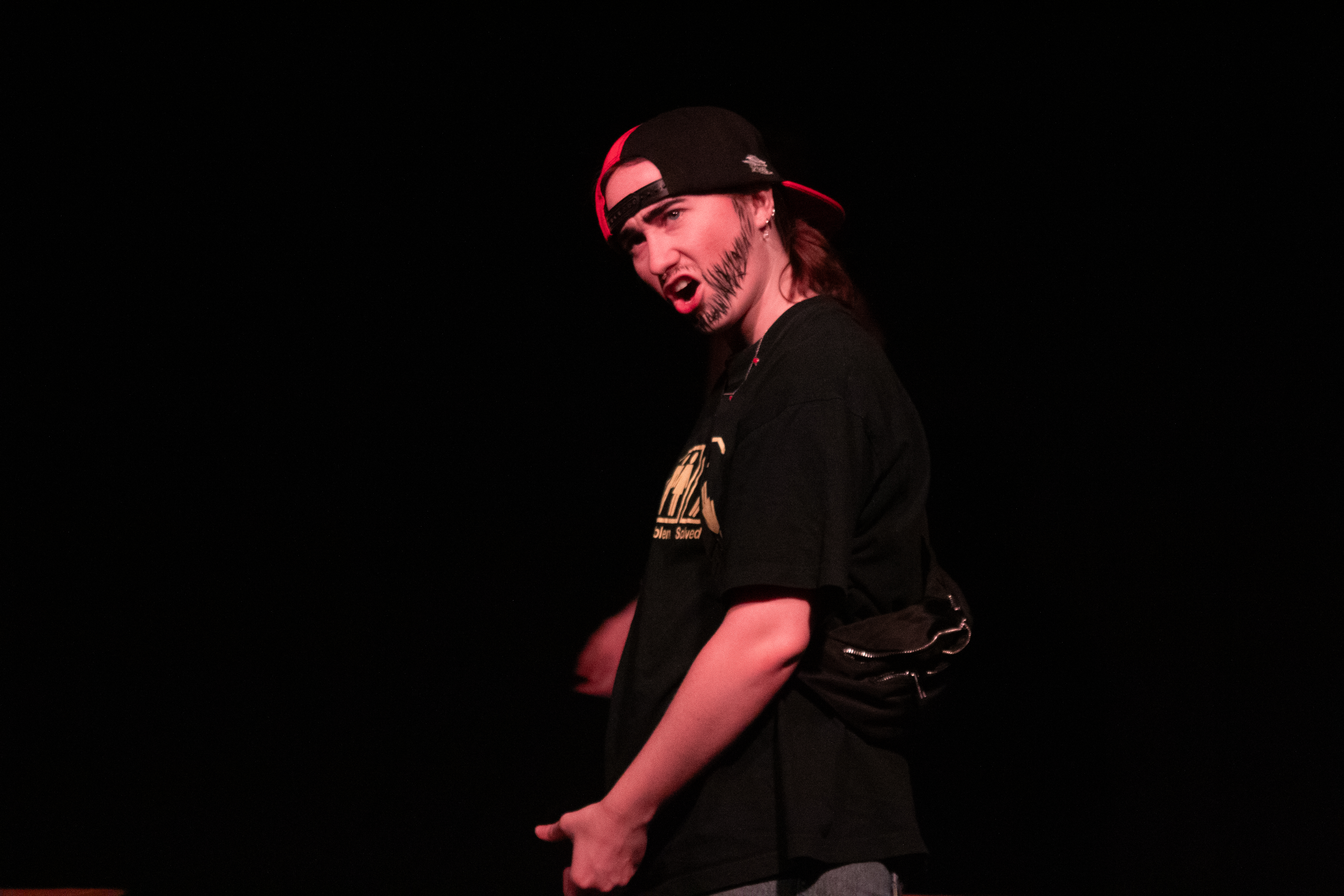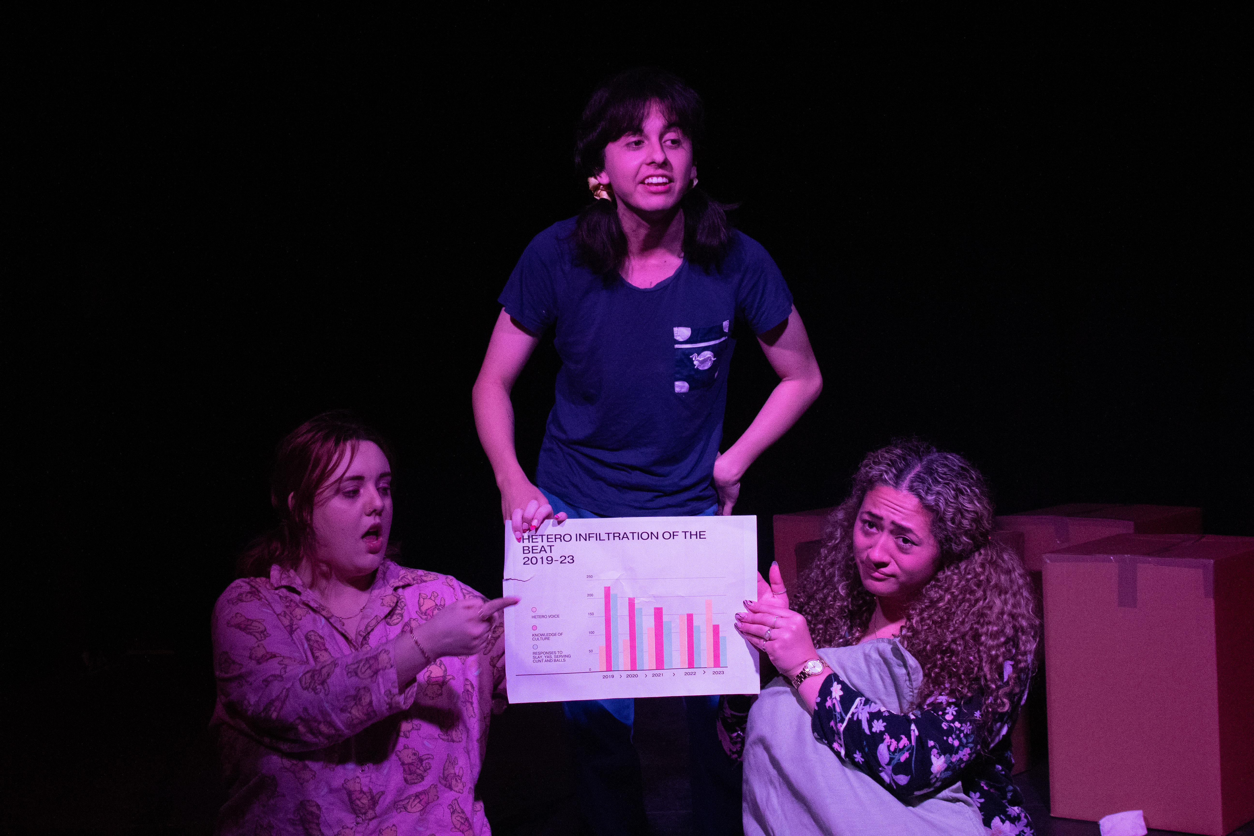 Lighting designed by Phoebe Quinn incorporated plenty of colour to set the mood and affirm the setting. Flashing lights added interest/texture to the movement sequences, backed by a high-energy soundtrack, and spotlights were shifted onto audience members during some moments of the play. Costuming clearly distinguished the characters, and changes throughout the play showed time passing and shifting settings. A number of cardboard boxes were versatile props throughout the performance, used as seats for the opening scenes and then upended, full of rubbish, to populate the later scenes.