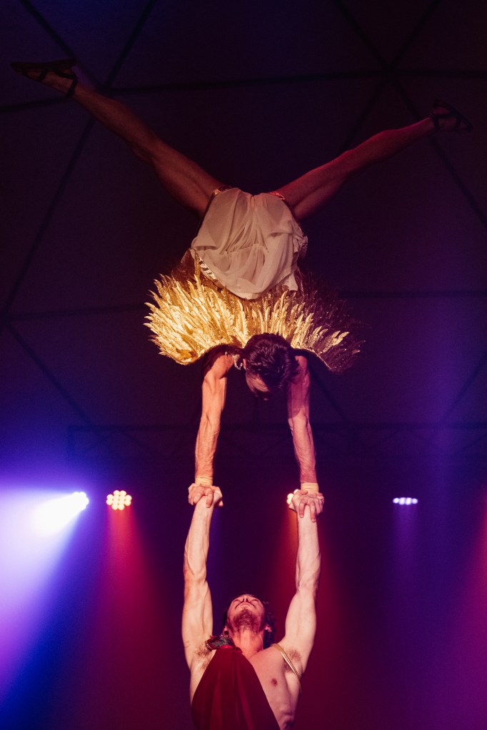 Melbourne-based performance company Head First Acrobats have brought their flagship show GODZ to the Spiegeltent at Wynnum Fringe, presenting a cheeky and high-energy adults-only acrobatics show grounded in Greek mythology.