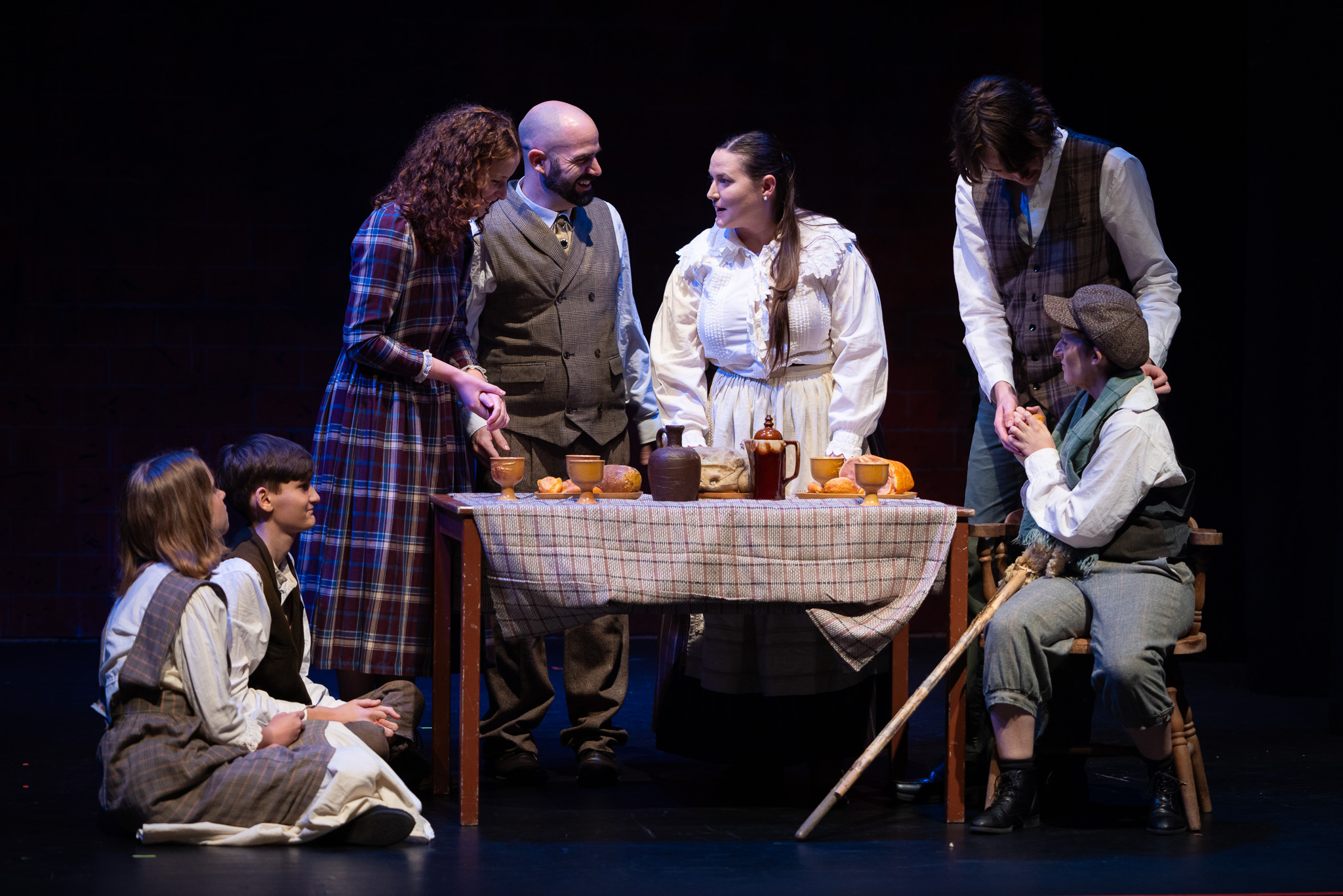 We were guided to our seats by an usher holding a lantern, and cast members later moved through the audience singing Christmas carols as the show began. The carolling, led by Choirmaster Timothy Buckney, continued both onstage and offstage at different points in the performance, adding to the atmosphere of the story. Ebenezer featured a large cast of more than 40 local actors, with a wide range of ages and experience, and there was a sense of warmth and camaraderie from the stage.