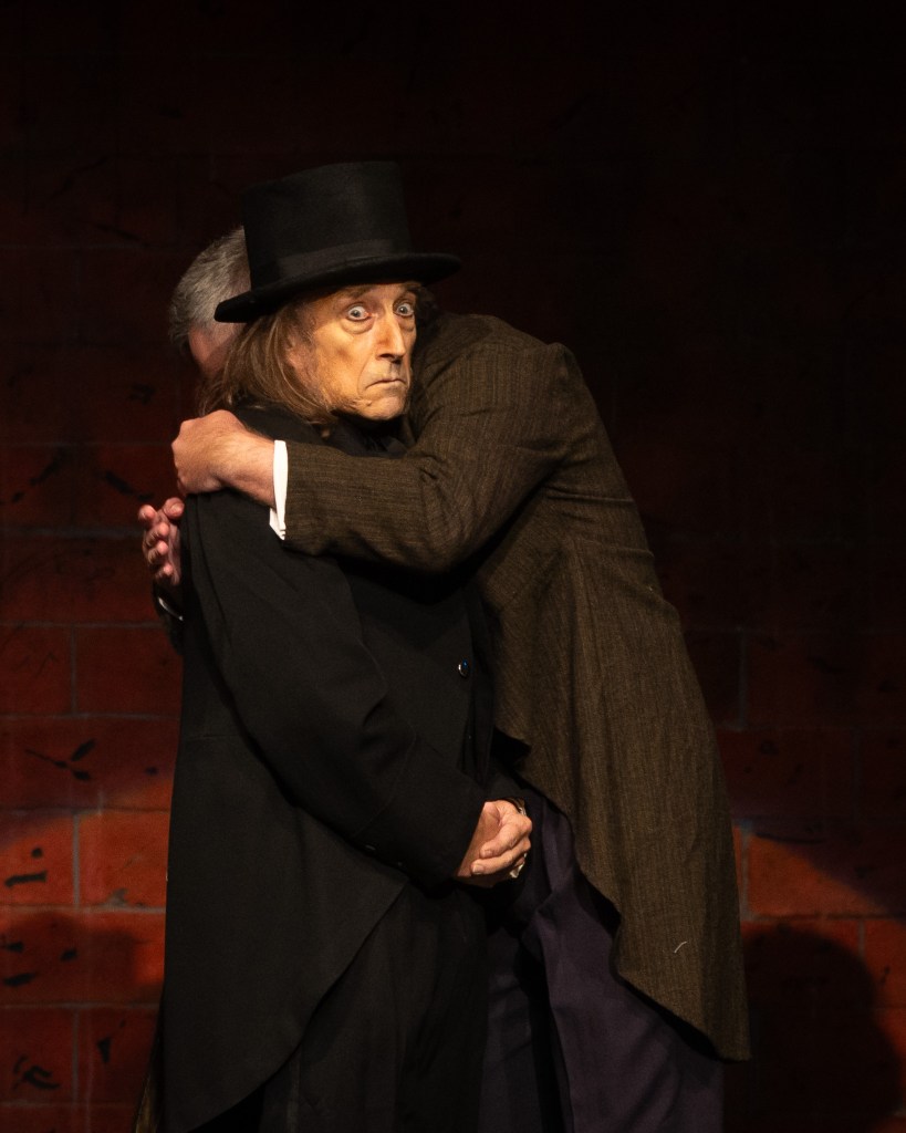 John Grey was brilliant as Ebenezer Scrooge, in turns sarcastic, cantankerous, furious, and movingly remorseful as he traversed Scrooge’s well-worn redemption arc. Equally versatile was Douglas Berry in the role of Bob Cratchit, providing comic relief as well as the emotional depths of grief at Tiny Tim’s future graveside. Charles Dickens also appeared as a character in Ebenezer, played by Reagan Warner and seated to the side of the stage, interacting with Scrooge occasionally as the story unfolded from his pen.