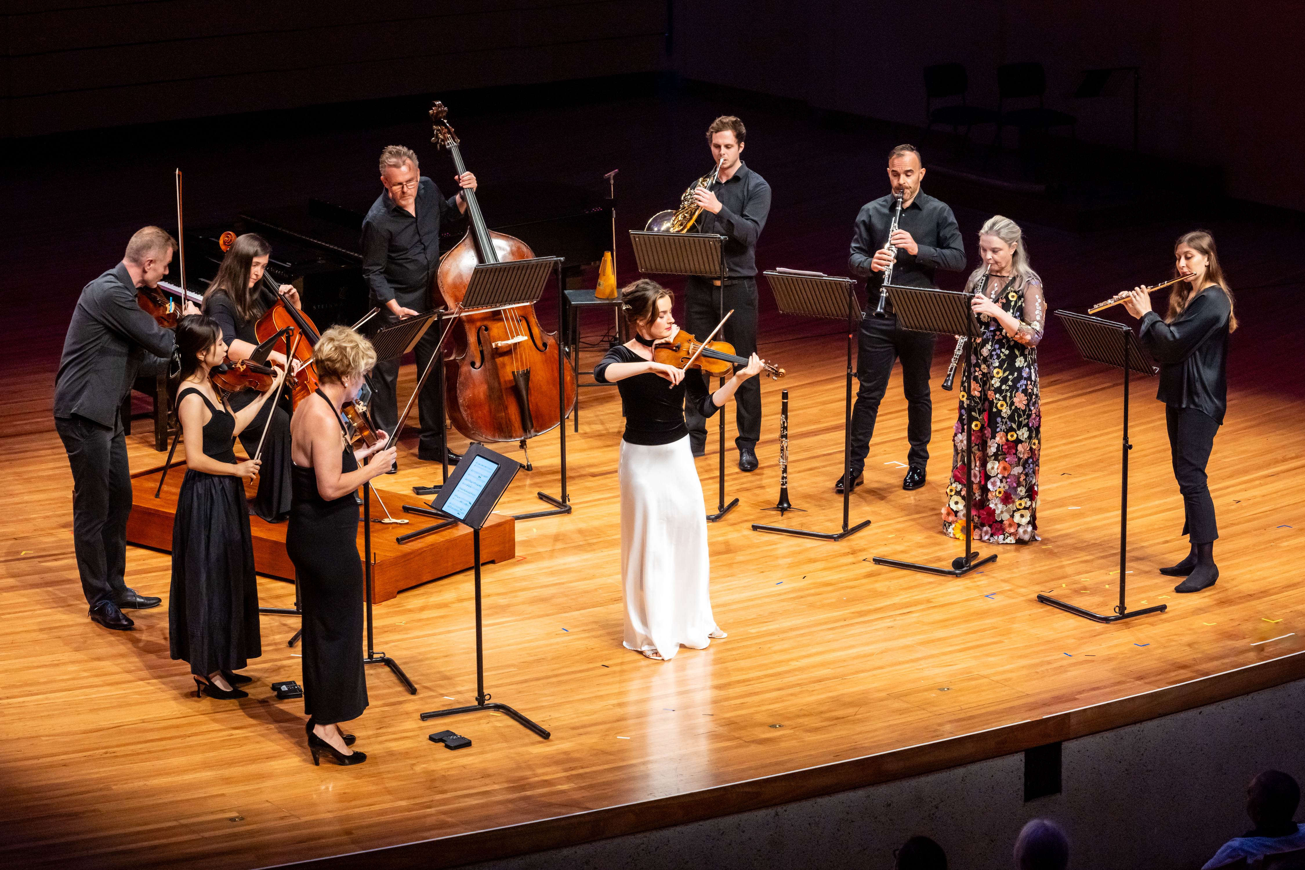 SXS Artistic Director Tania Frazer then introduced guest soloist Amalia Hall, recently returned from performances in Europe and soon to be performing six concertos in six weeks across Central and South America. Hall stood in the centre of the ring of musicians – SXS play without a conductor, and it is always fascinating to watch the way the musicians communicate with one another onstage – for the world premiere of a new arrangement, by Tania Frazer, of Claude Debussy’s Violin Sonata in G minor. Considered to be Debussy’s final work, the sonata reflects the inner and outer turmoil of his final years, between his declining health and World War I. The first movement, Allegro Vivo, was full of shifting moods and speeds, coming to a sharp finish and followed by the playful, but darker, Intermède: Fantastique et léger. The Finale: Très animé retained this sense of the fantastical, with strange and sudden bursts of colour and speed. Hall had an impeccable sense of timing, finding tiny pauses in the music and leading the piece to an uplifting finish.