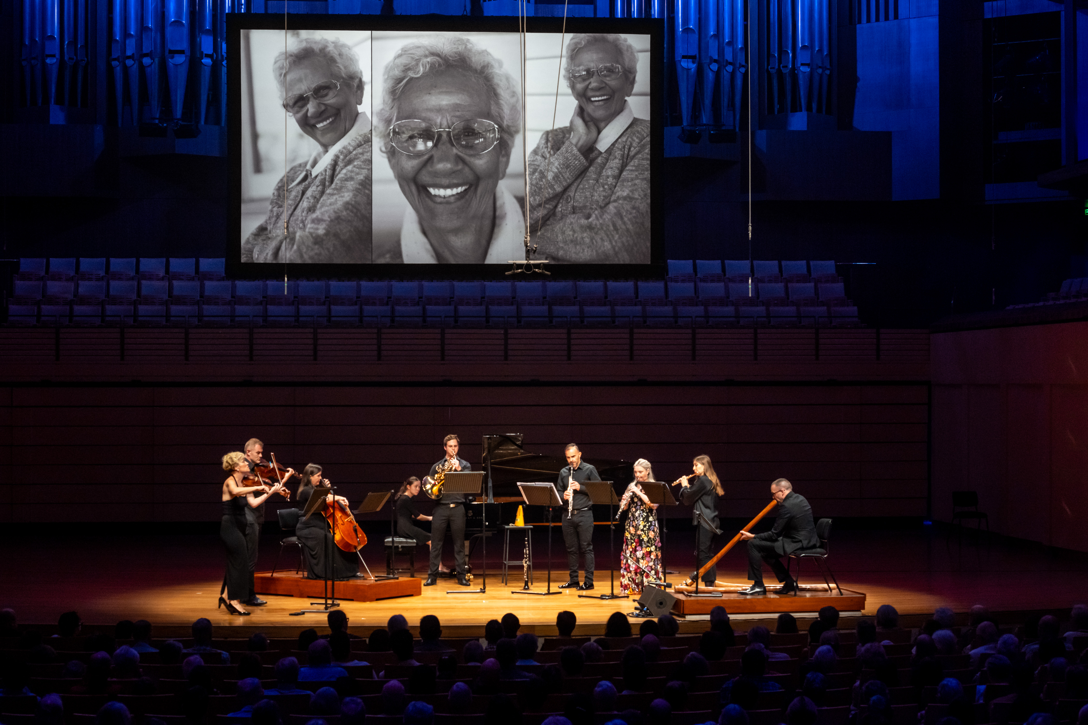 SXS Didgeridoo Artist in Residence Chris Williams then took the stage to speak about the next piece, a world premiere co-composed with Sean O’Boyle through the SXS Didgeridoo Commissioning Project 2023 and a tribute to Wakka Wakka woman, and Chris’ grandmother, Maureen Williams. He described The Wise Woman as “her story, in song” and spoke about the extraordinary life and generational legacy of his grandmother. Photos of Maureen Williams were projected above the musicians as they played.