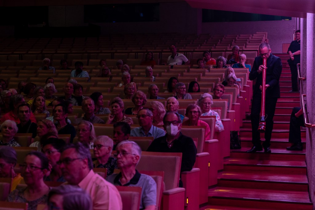 The Wise Woman began with the notes passing between the instruments, as a story is passed down to future generations. From the gentle idyll of a riverbank, there was rising heat and a ferocity of spirit before the distinct sounds of a carnival that Williams’ intended to evoke, specifically, the Longreach showgrounds. Fragments of Crimond (The Lord is My Shepherd) were woven together with the traditional Wakka Wakka song Gurri Ngindin Narmi, which Williams sang partly through his instrument. Williams played three different didgeridoos throughout the piece and moved into the audience while he played, circling the auditorium and eventually returning to the stage. The sound of the music shifted as it moved around the listeners, and the ending of the piece felt bright and hopeful, looking toward the future.