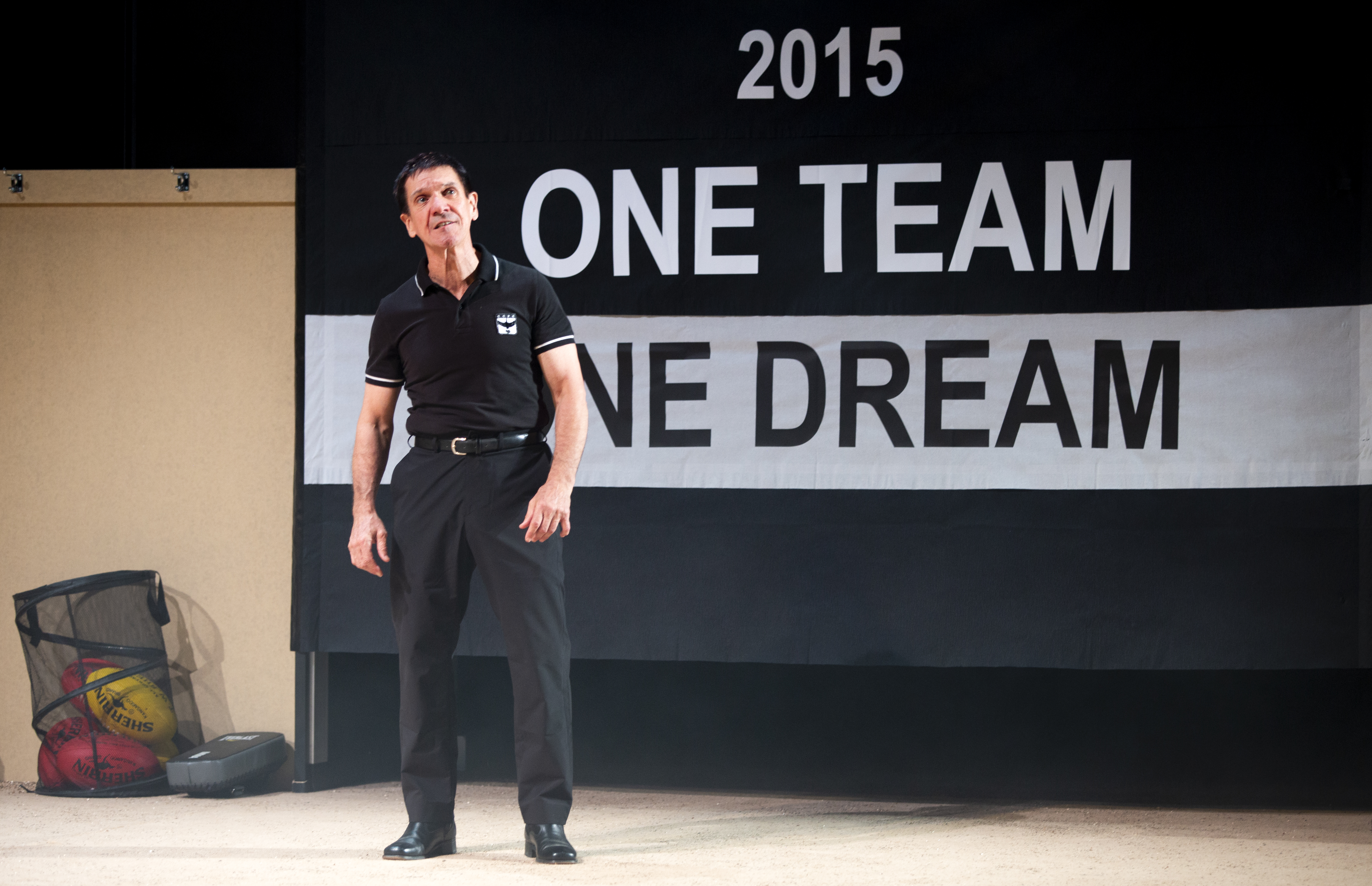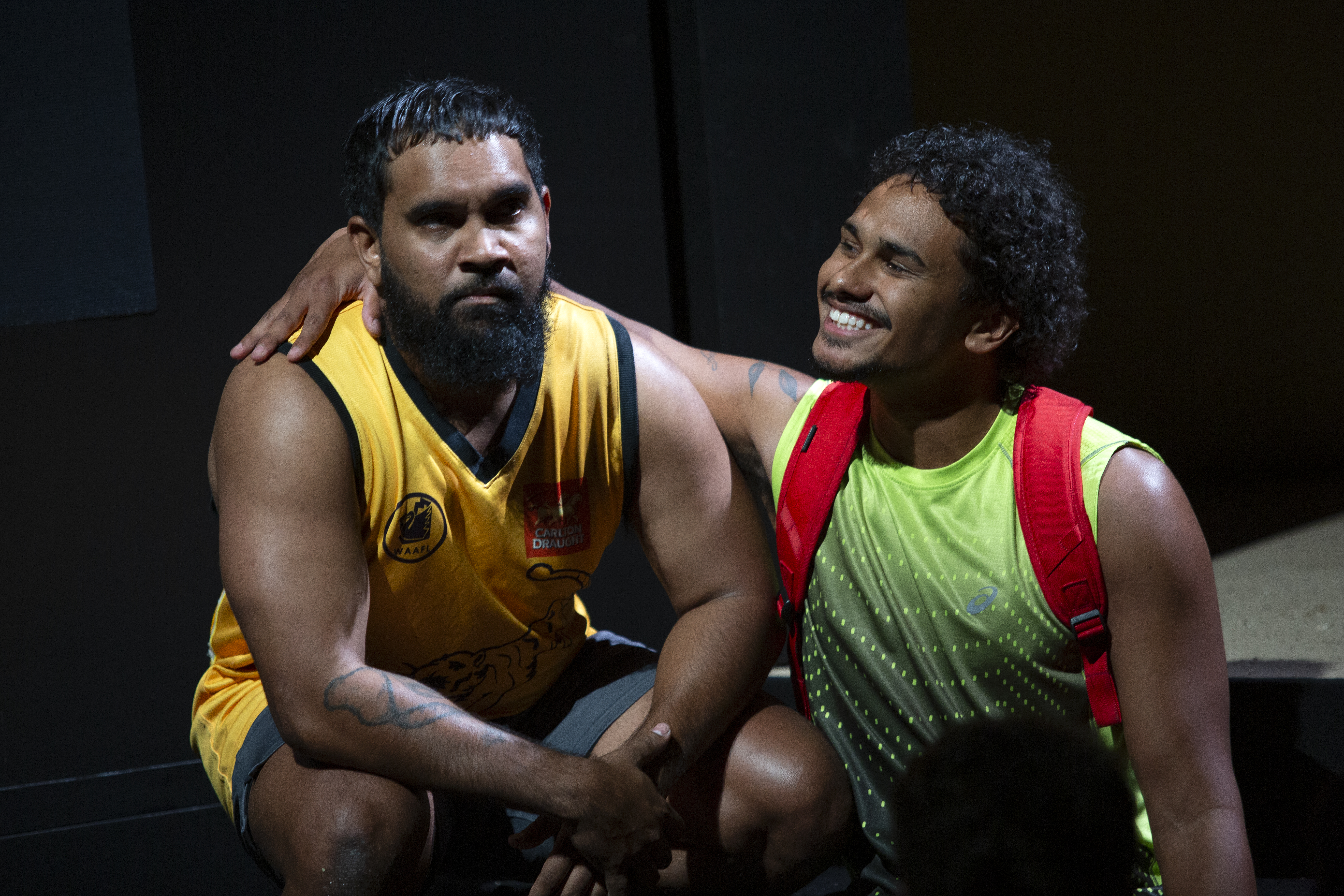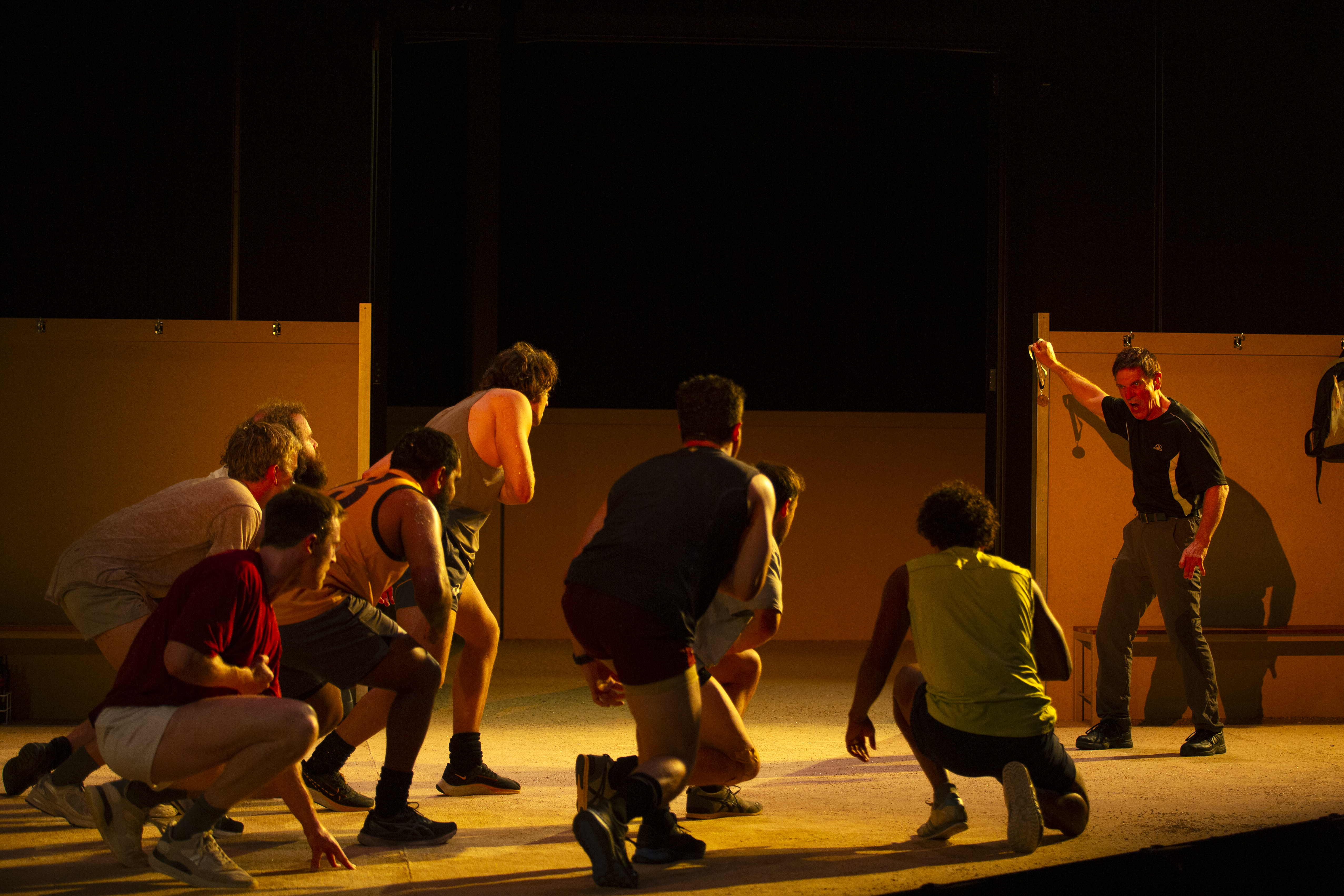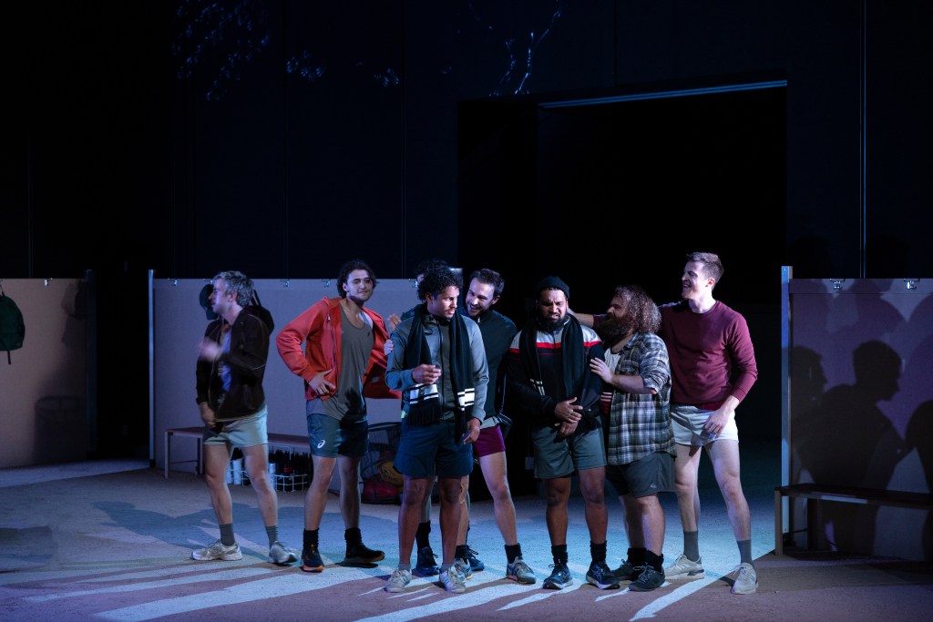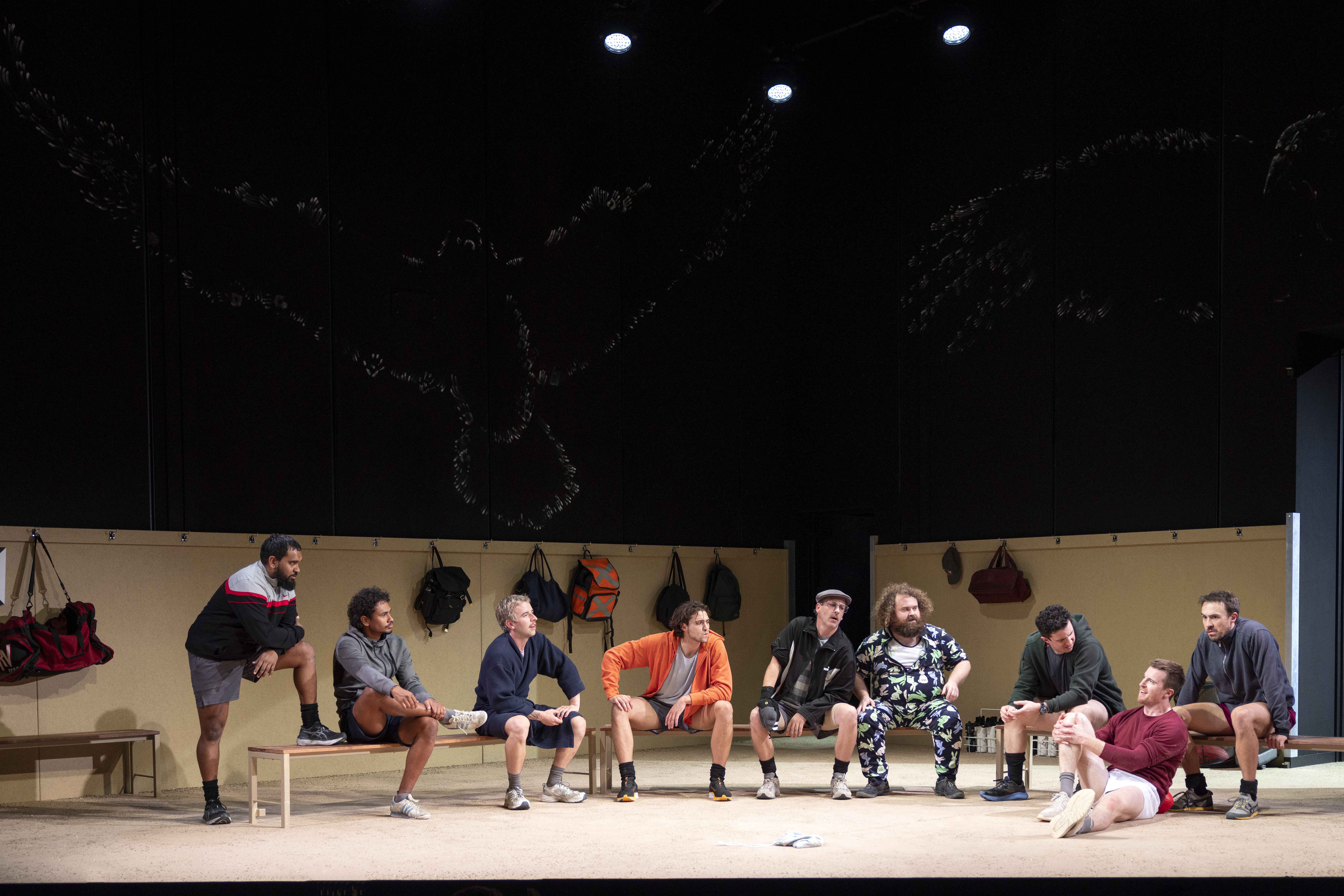 Lighting design by Ben Hughes and composition and sound design by James Henry, with Associate Sound Designer Wil Hughes, contributed significantly to the atmosphere and tension of the play, especially during the training and game montages. Set and costume design by Dale Ferguson included the large design of a currawong watching from the walls, and locker room benches were rearranged by the players to form other key locations. Even identically dressed in their team uniforms, the Currawongs’ costuming distinguished and deepened their characters with additions and accessories like safety gear, compression undergarments, and strapping tape.
