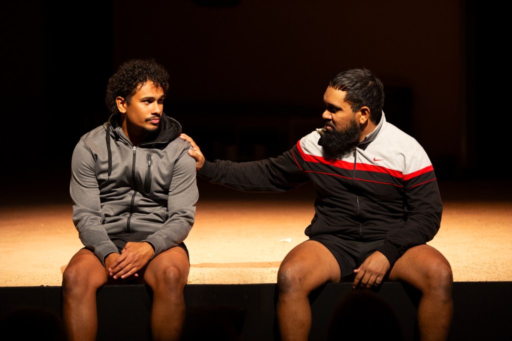 The structure of the play allowed the audience to hear the comments and conversations about the Marngrook cousins that happened behind their back as well as to their faces. Sonny and Jayma’s experiences were also contrasted against those of their teammates Ant (Costa D’Angelo), who was Italian-Australian, and Gorby (Mitchell Brotz), who the other players teased about his weight and intelligence. The character of Apples (Samuel Buckley) was perhaps the least believable in context but served an important dramatic purpose, acting as a counterpoint to the extremes that Woodsy represented and speaking up repeatedly against his teammates’ bad behaviour.
