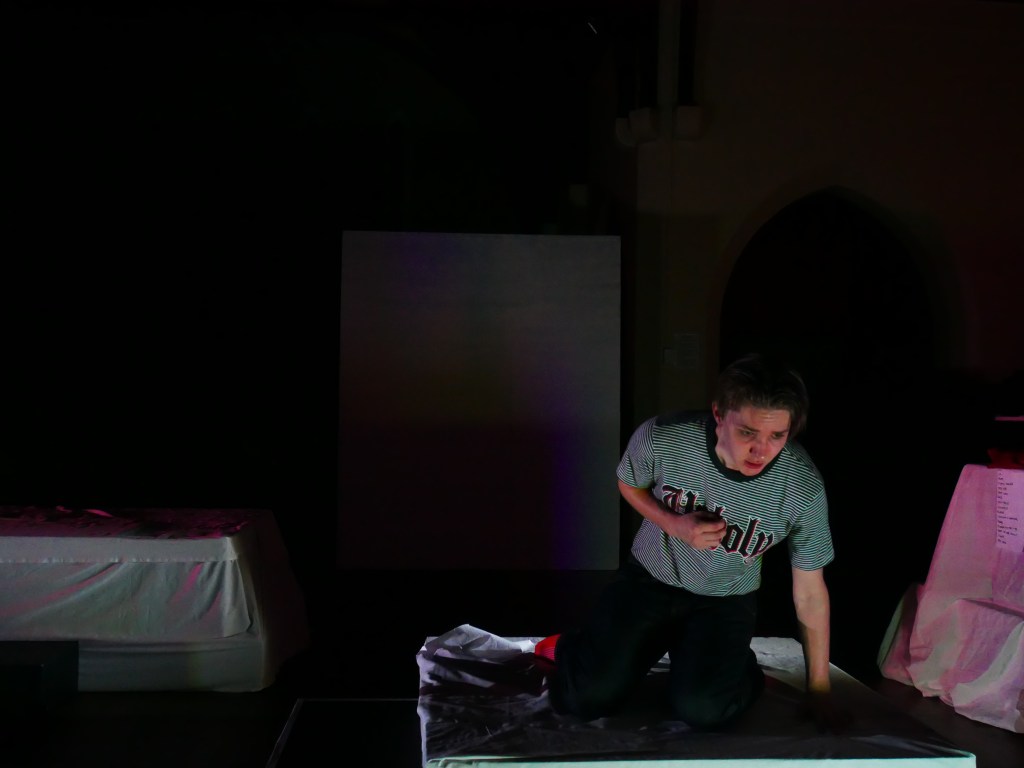 Tonight with Donny Stixx and Dark Vanilla Jungle were performed in the Holy Trinity Church Hall, and the actors managed the complicated acoustics well, although Mason’s dialogue occasionally became indistinct when he changed volume quickly. Large panels at the back of the stage area assisted with the acoustics in the large space and provided a backstage/offstage area for the actors.