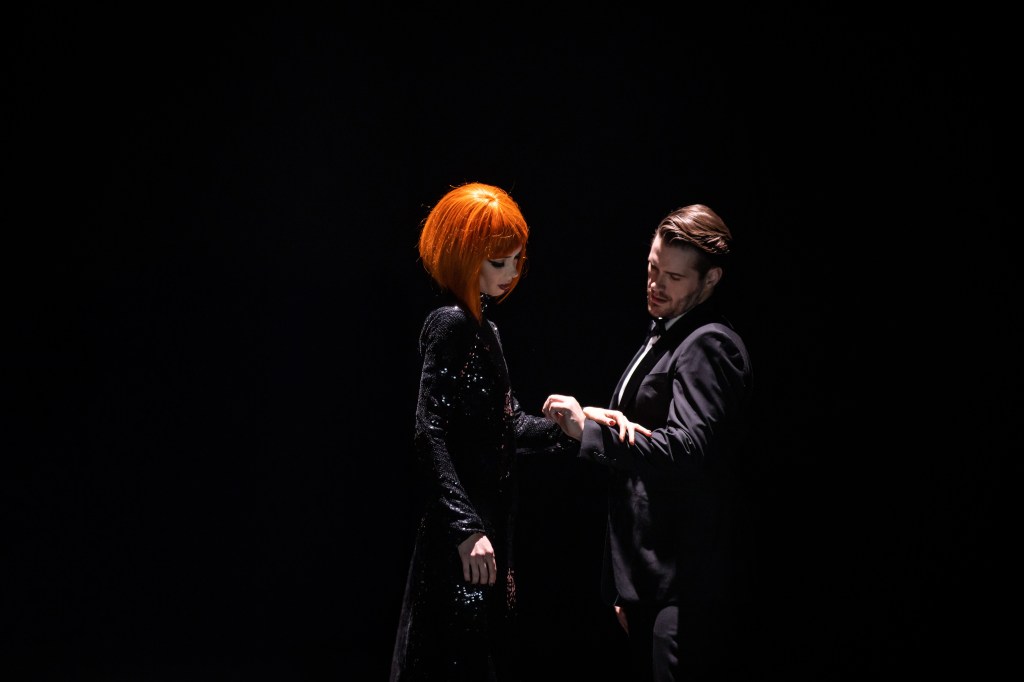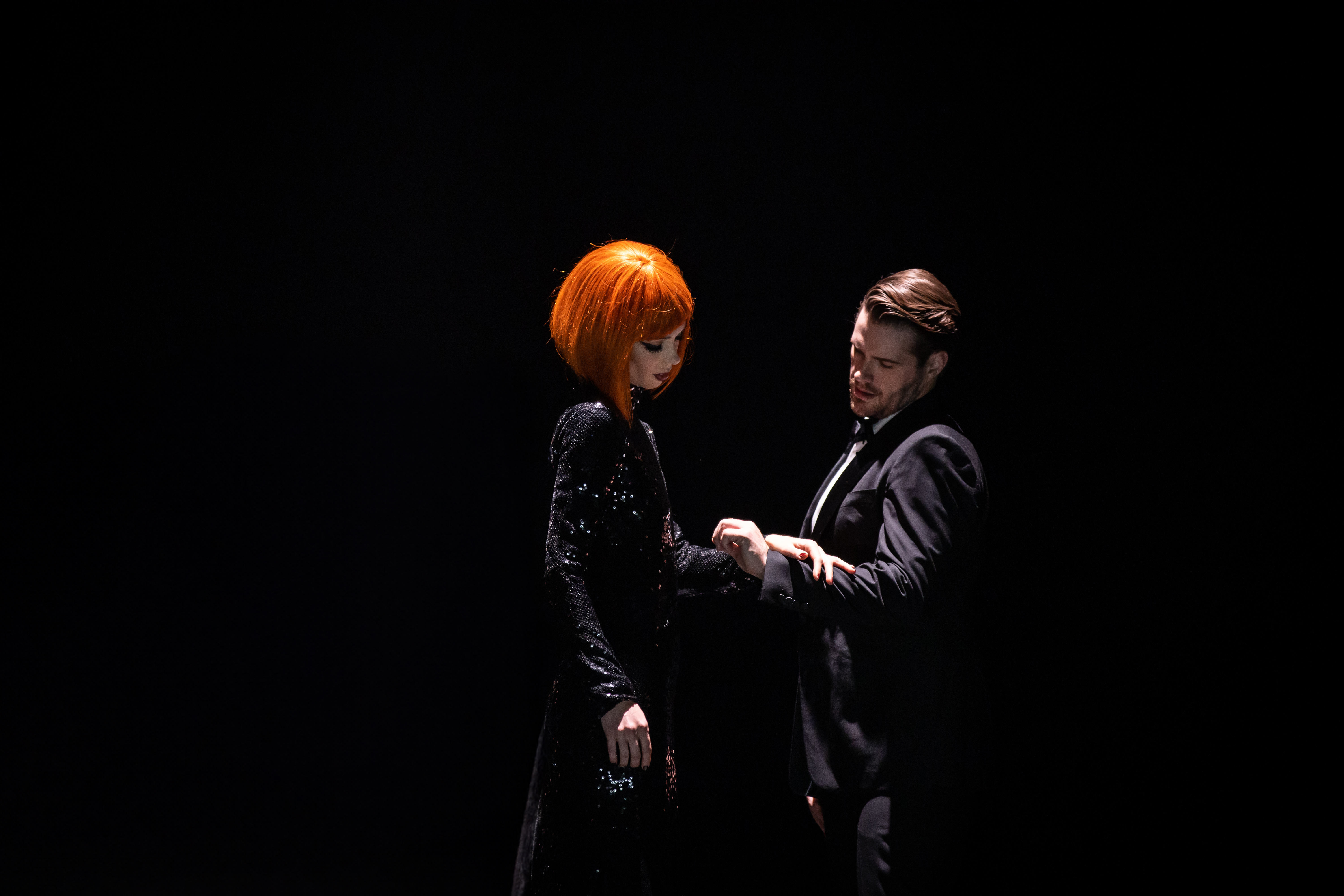 Using a black-and-white colour palette with warm splashes of red and orange, Dido and Aeneas was filled with striking shadows and silhouettes. Lighting design by Matthew Marshall was a key part of the visual spectacle, making use of dramatic spotlights and shifting the parameters of the stage without props or sets, only curtains and scrims.
