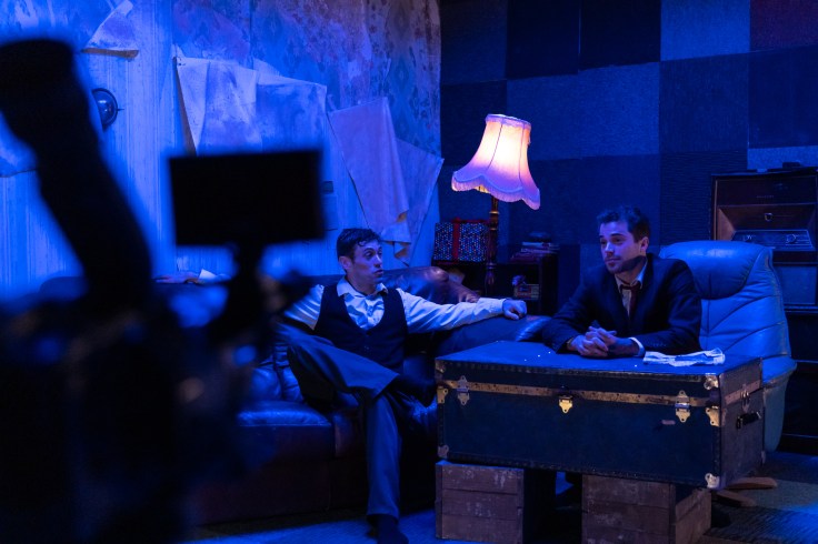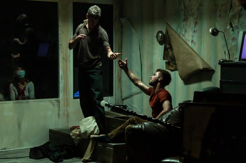 The Volcano set, designed by Alyson Cummins and Pai Rathaya, seemed like a dilapidated living room – there was a couch, and a shelf of records, but the wallpaper was crumbling and there was no door. Posters changed to represent the passage of time, and the two men literally tore down the walls at different times in an attempt to understand or escape their fate. Murphy and Goldsmith were constantly shifting props, stringing and re-stringing lighting, and directing one another from behind the camera; even scenes of destruction and desperation flowed with ease and grace.