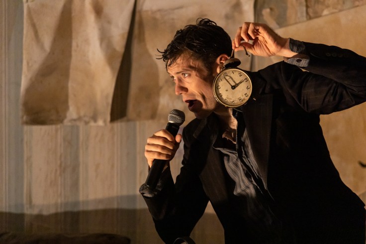 Composition and sound design by Rob Moloney, with music mixing by Chaz Moloney, contributed to high pressure sound design that continued to ratchet up the tension. Music from a range of eras was included, and the opening drums of Sing Sing Sing became increasingly eerie as they repeated. Pre-recorded film, created by Pato Cassinoni, was also incorporated into the performance and was crucial to the worldbuilding and escalating revelations.