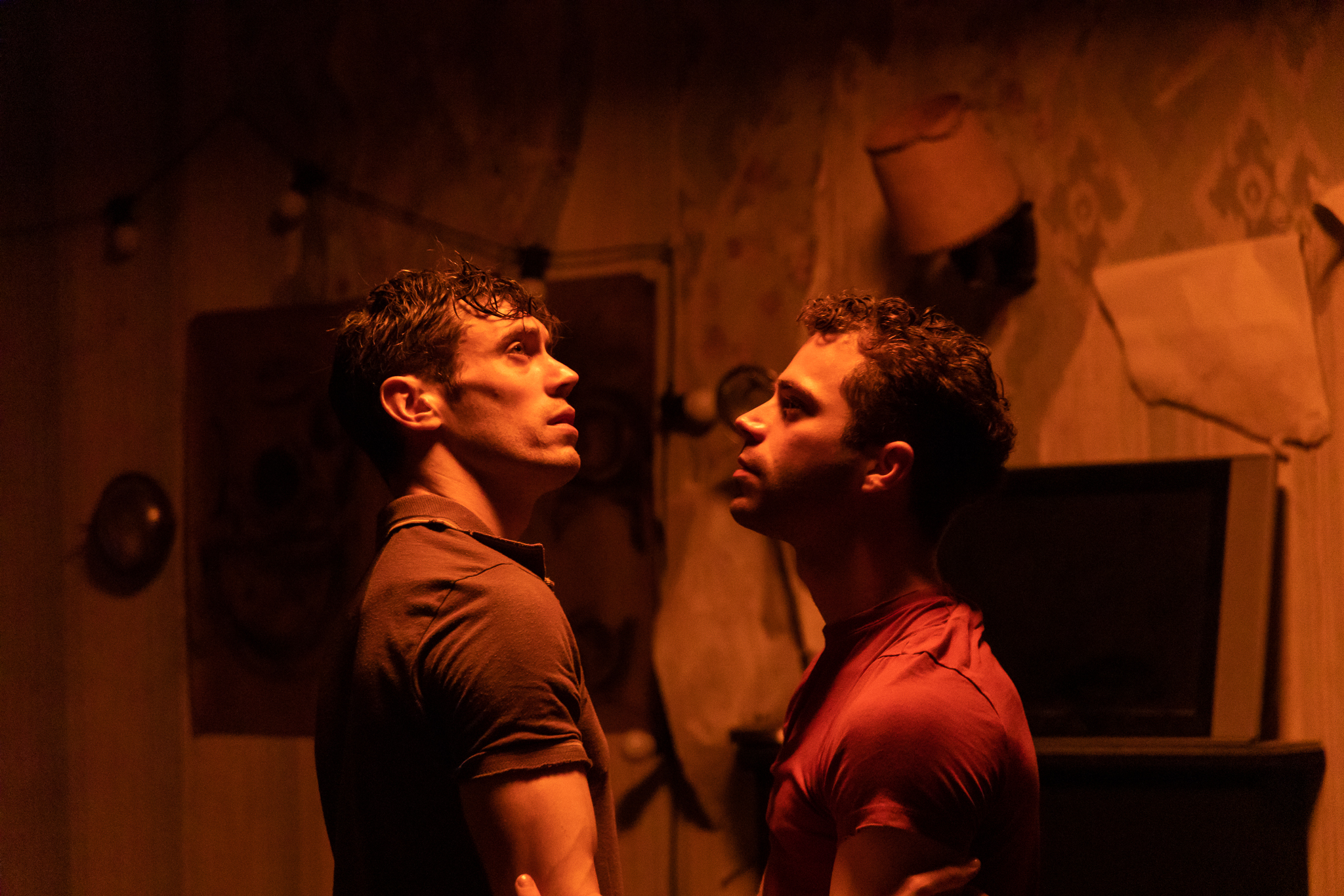 The Volcano set, designed by Alyson Cummins and Pai Rathaya, seemed like a dilapidated living room – there was a couch, and a shelf of records, but the wallpaper was crumbling and there was no door. Posters changed to represent the passage of time, and the two men literally tore down the walls at different times in an attempt to understand or escape their fate. Murphy and Goldsmith were constantly shifting props, stringing and re-stringing lighting, and directing one another from behind the camera; even scenes of destruction and desperation flowed with ease and grace.